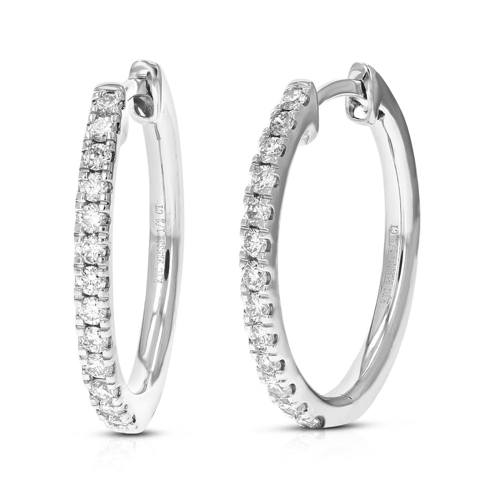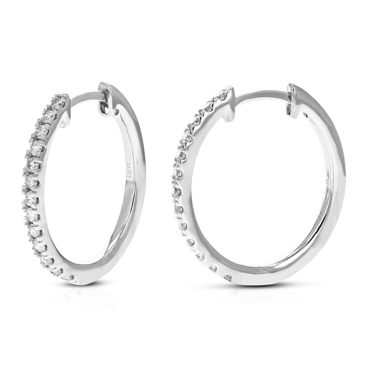 Made in .925 sterling silver with 1/2 cttw of lab-grown round diamonds, H-I color, SI1-SI2 clarity. Set with 26 prong-set diamonds. Hoop dimensions: 21mm height (3/4 inch), 2mm width (1/10 inch).