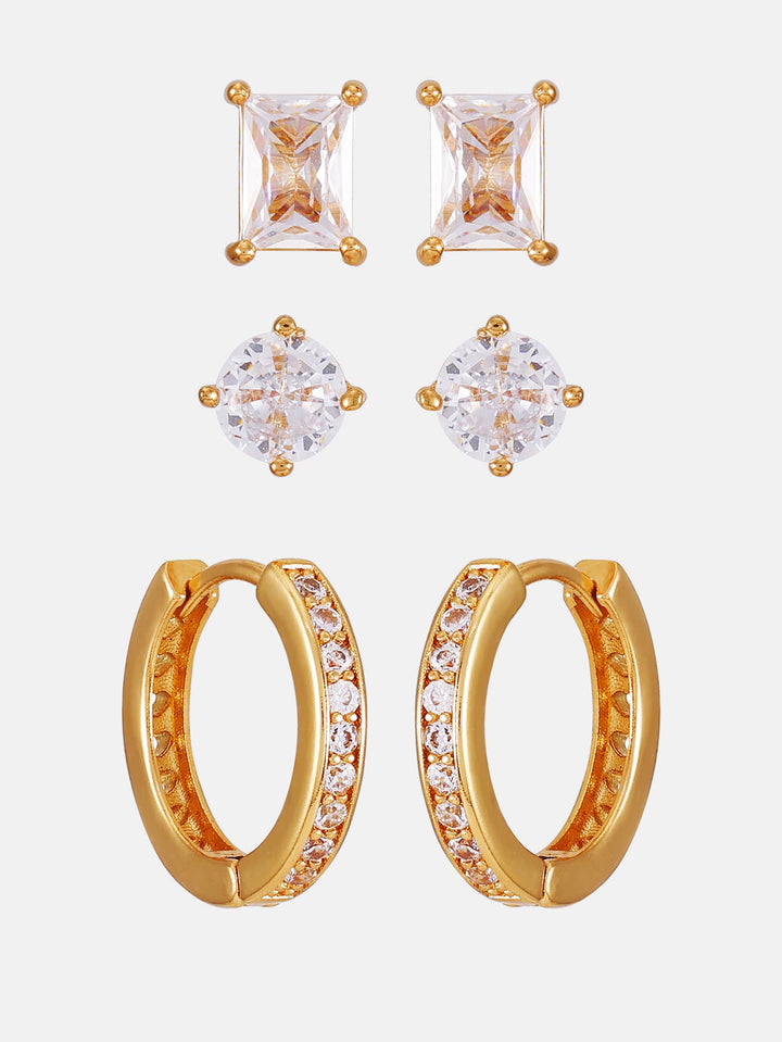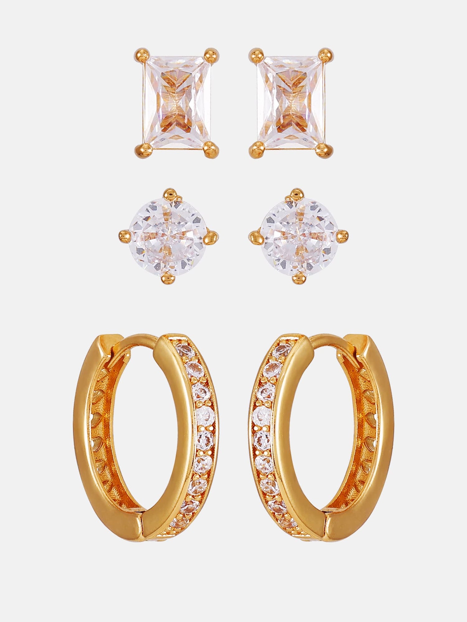 Gold-tone metal, 3 pairs (studs and huggies), post-back closures for the studs and snap-back closures for the huggies.