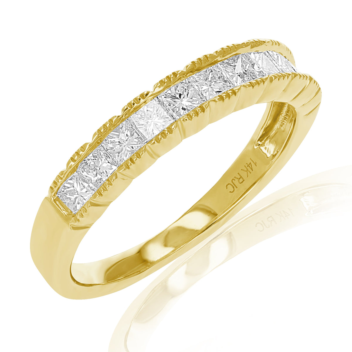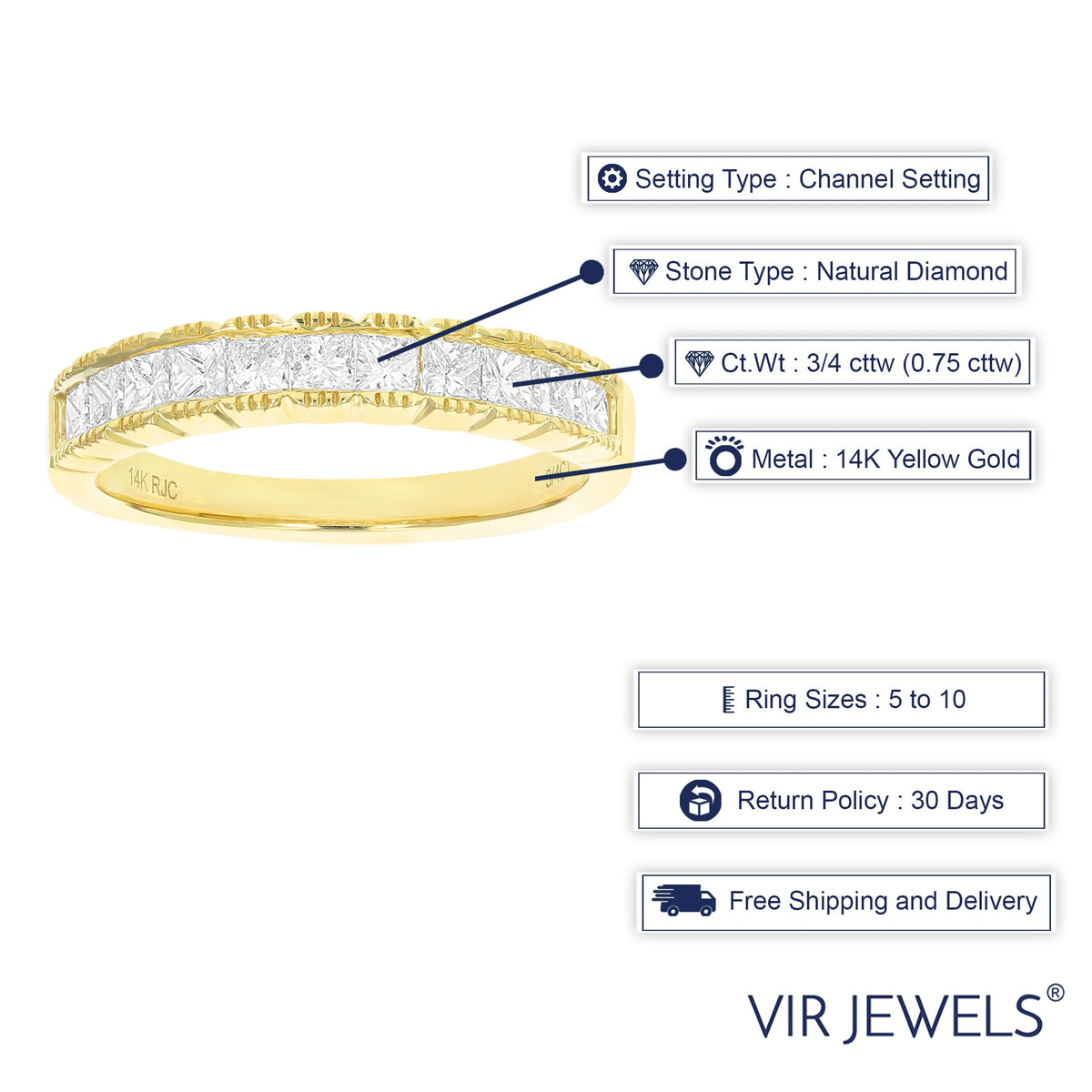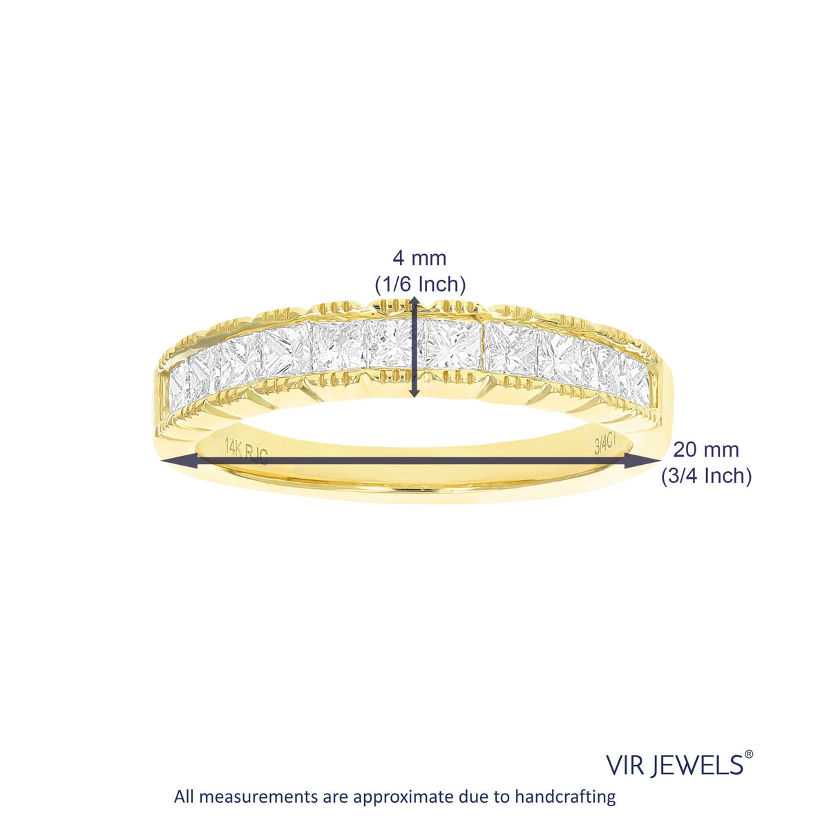 This 3/4 Cttw Princess Cut Diamond Wedding Band with Milgrain by Vir Jewels features 11 natural princess-cut diamonds set in a channel setting with milgrain. The unique design of this wedding band adds a touch of vintage charm, making it perfect for those who love intricate details. Crafted from 14K white or yellow gold, this ring can be worn alone or paired with an engagement ring for a more personalized look. The band is 4mm wide and weighs 2.20 grams, making it the perfect balance of elegance and comfort.