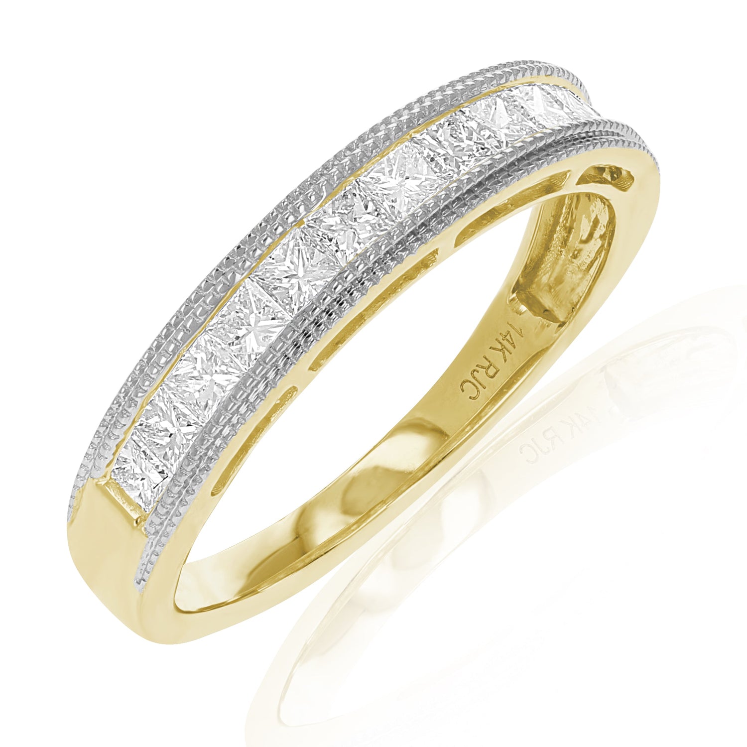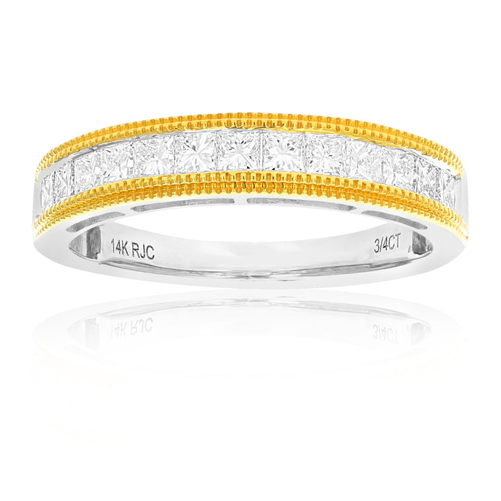 This 3/4 Cttw Princess Cut Diamond Wedding Band with Milgrain in 14K Gold by Vir Jewels features 13 princess-cut diamonds set in a channel setting with milgrain. The added sparkle of these natural diamonds, combined with the milgrain detailing, makes this band an exquisite addition to any jewelry collection. Available in both white and yellow gold plating, it makes for a beautiful and timeless wedding or anniversary band. The band measures 4mm in width, providing a comfortable yet striking design.