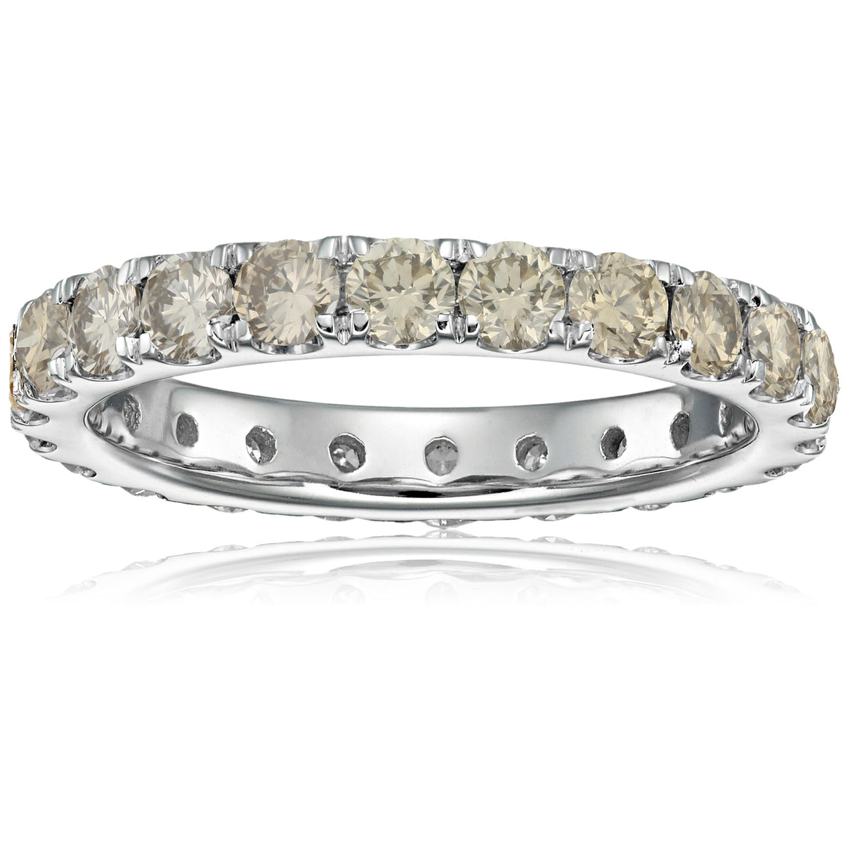 This 3 Cttw Champagne Diamond Eternity Ring Wedding Band in 14K Gold by Vir Jewels features stunning round champagne diamonds set in a prong setting, totaling 3 carats. The ring, available in white or yellow gold, showcases 17 to 21 diamonds (depending on the size), with each diamond's natural brown color offering a warm, unique touch. This band is perfect as a wedding band or for special occasions.