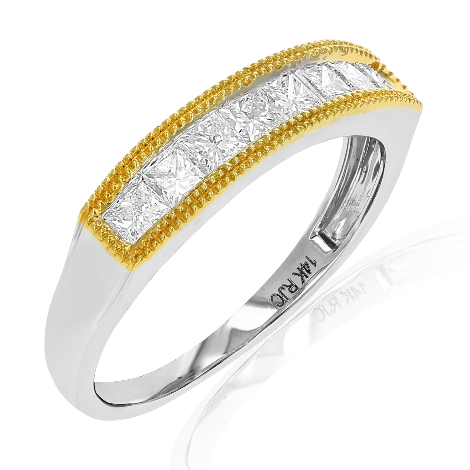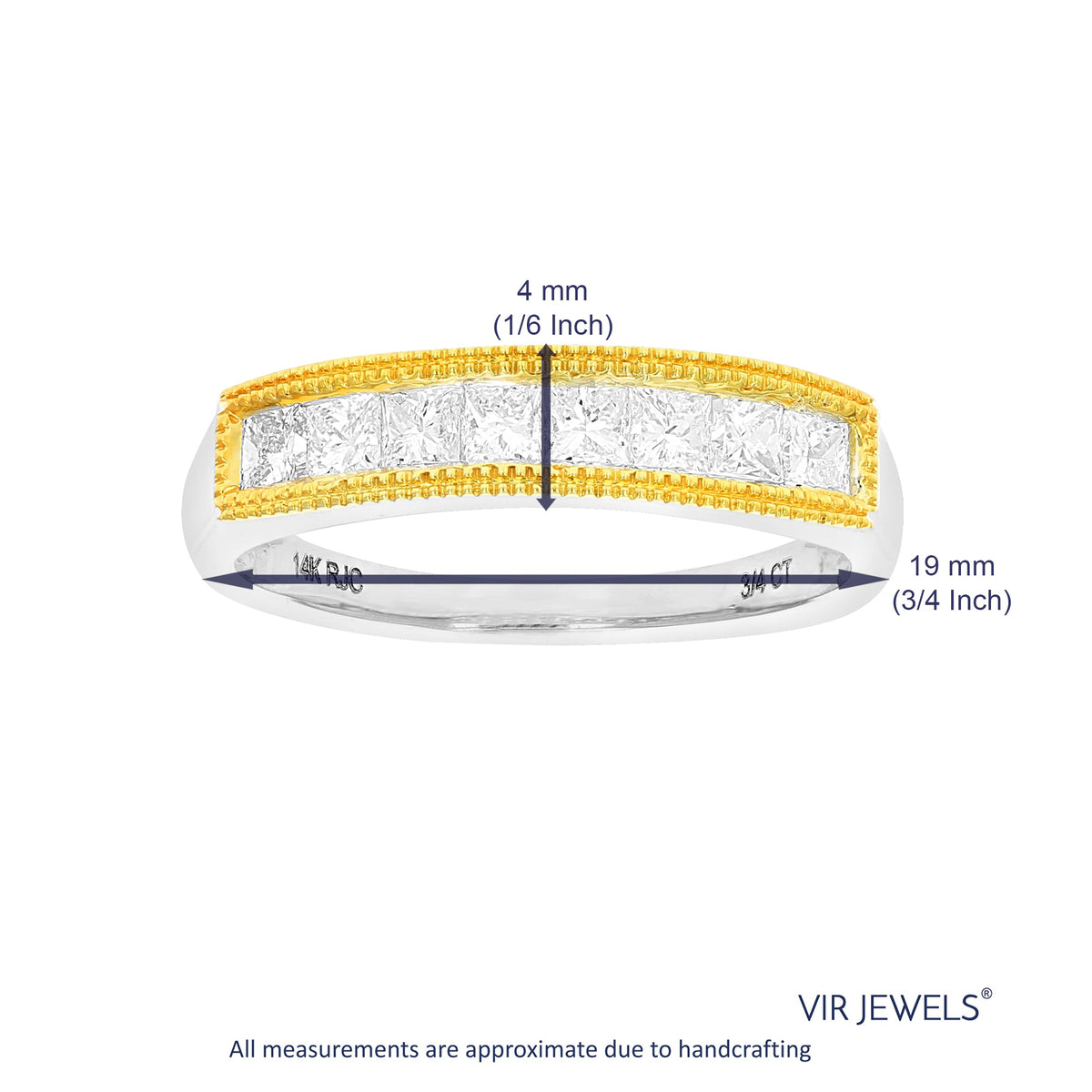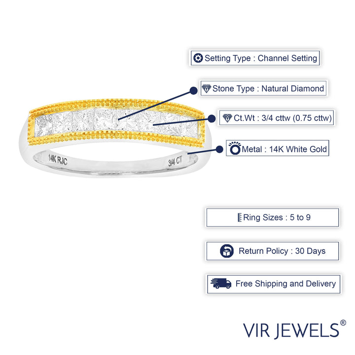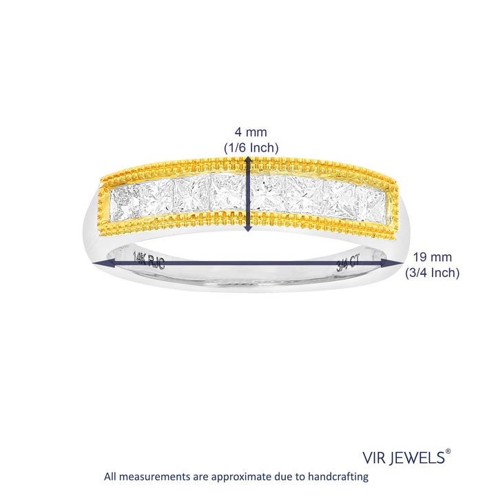 This 3/4 Cttw Princess Cut Diamond Wedding Band with Milgrain in 14K Gold by Vir Jewels offers a sophisticated and timeless design. Featuring 8 sparkling princess-cut diamonds set in a channel setting with milgrain, this ring exudes elegance and style. The milgrain detailing adds a vintage-inspired touch, enhancing the overall design. Crafted from 14K gold with either white or yellow gold plating, this band is a perfect choice for those seeking a refined, classic wedding band. The width of the band is 4mm, making it a delicate yet bold statement piece.