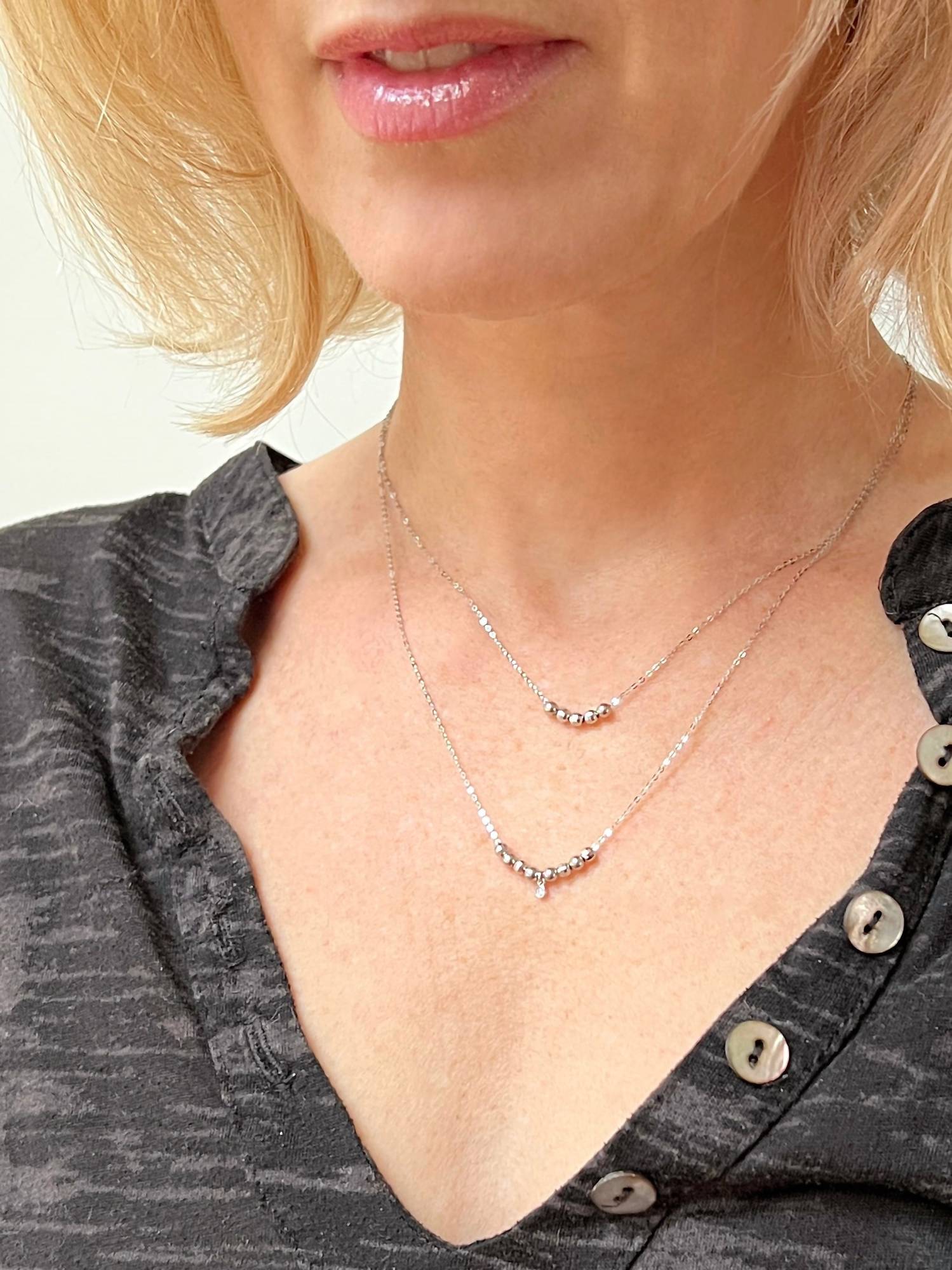 14K White Gold. 2.5mm diamond bezel with a 2mm diamond (.03 carat). Faceted and smooth beads. Adjustable chain: 16-18 inches. Made in the USA.