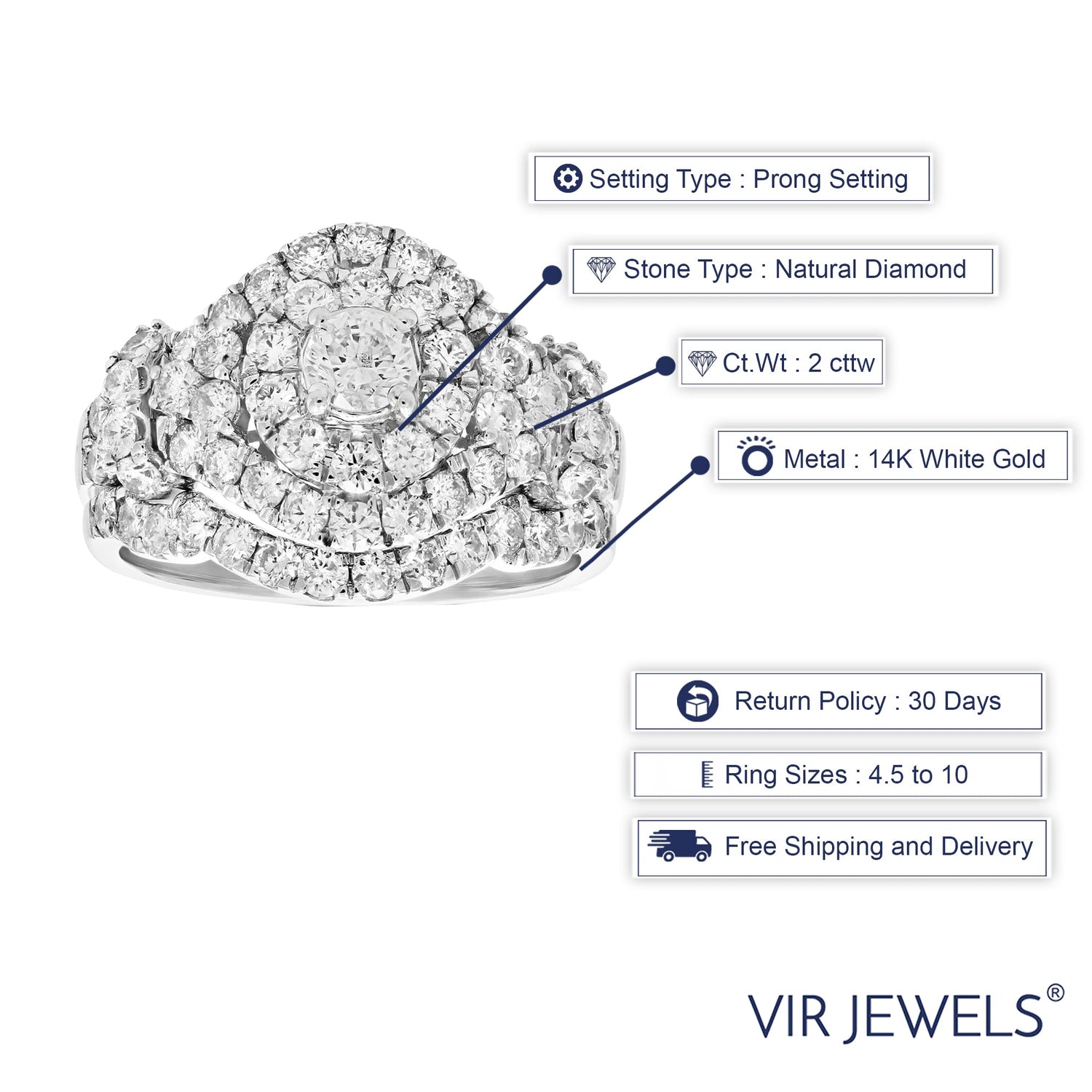 This 2 Cttw Diamond Wedding Engagement Ring Set in 14K White Gold Cluster Bridal Design by Vir Jewels features 65 dazzling diamonds, including a 0.31 ct center diamond surrounded by 1.69 carats of sparkling side diamonds. The design is perfect for both the engagement and wedding bands, giving you timeless beauty and brilliance. This set comes with a gift box, making it an ideal gift for that special someone.
