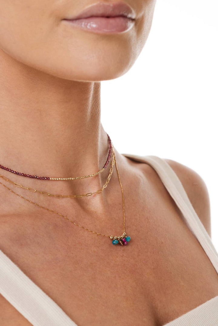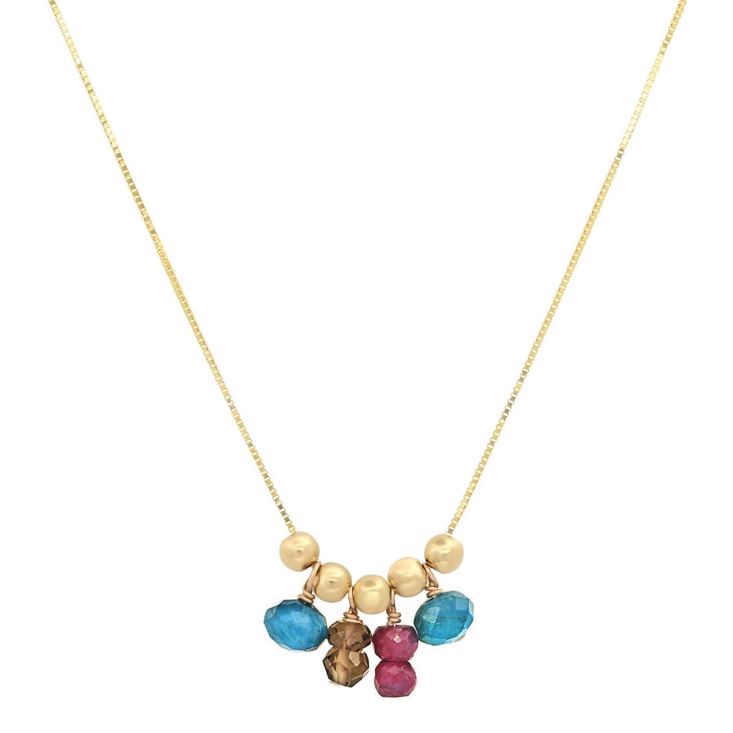 14K yellow gold beads. Gemstone drops: Rubies (3.5mm), Smoky Topaz (3mm), Apatite (5x7mm). 14K box chain (18 inches). Made in the USA.