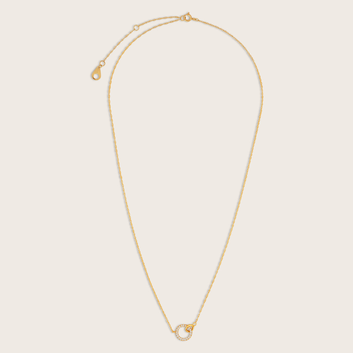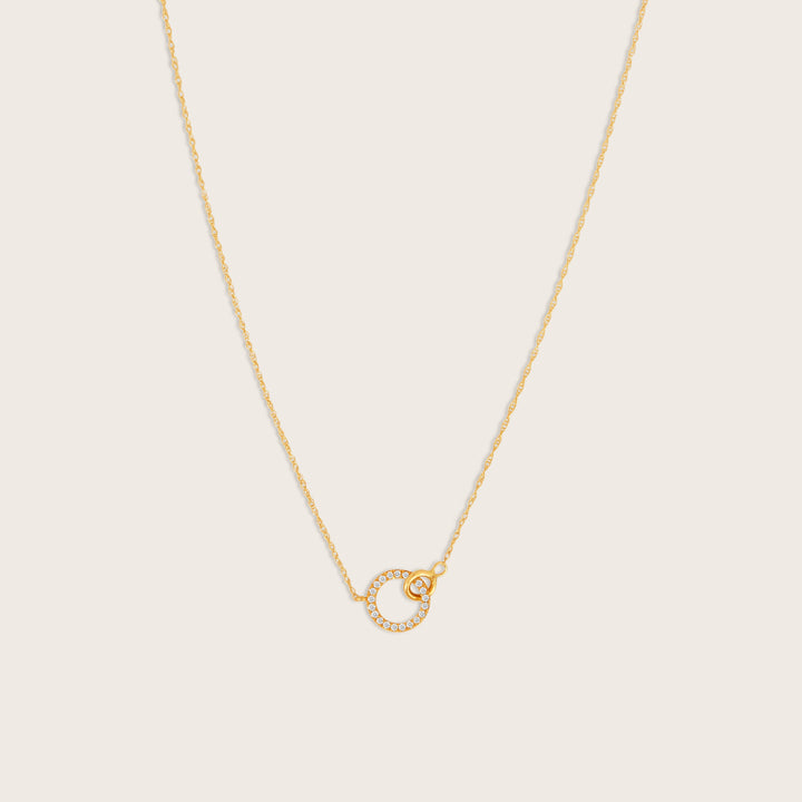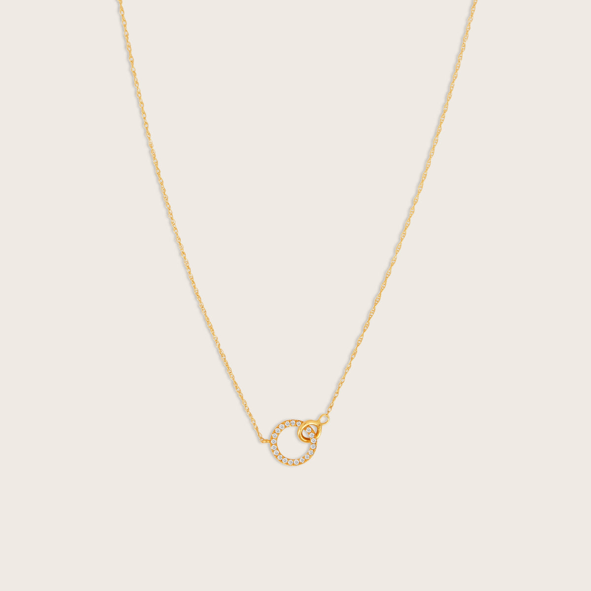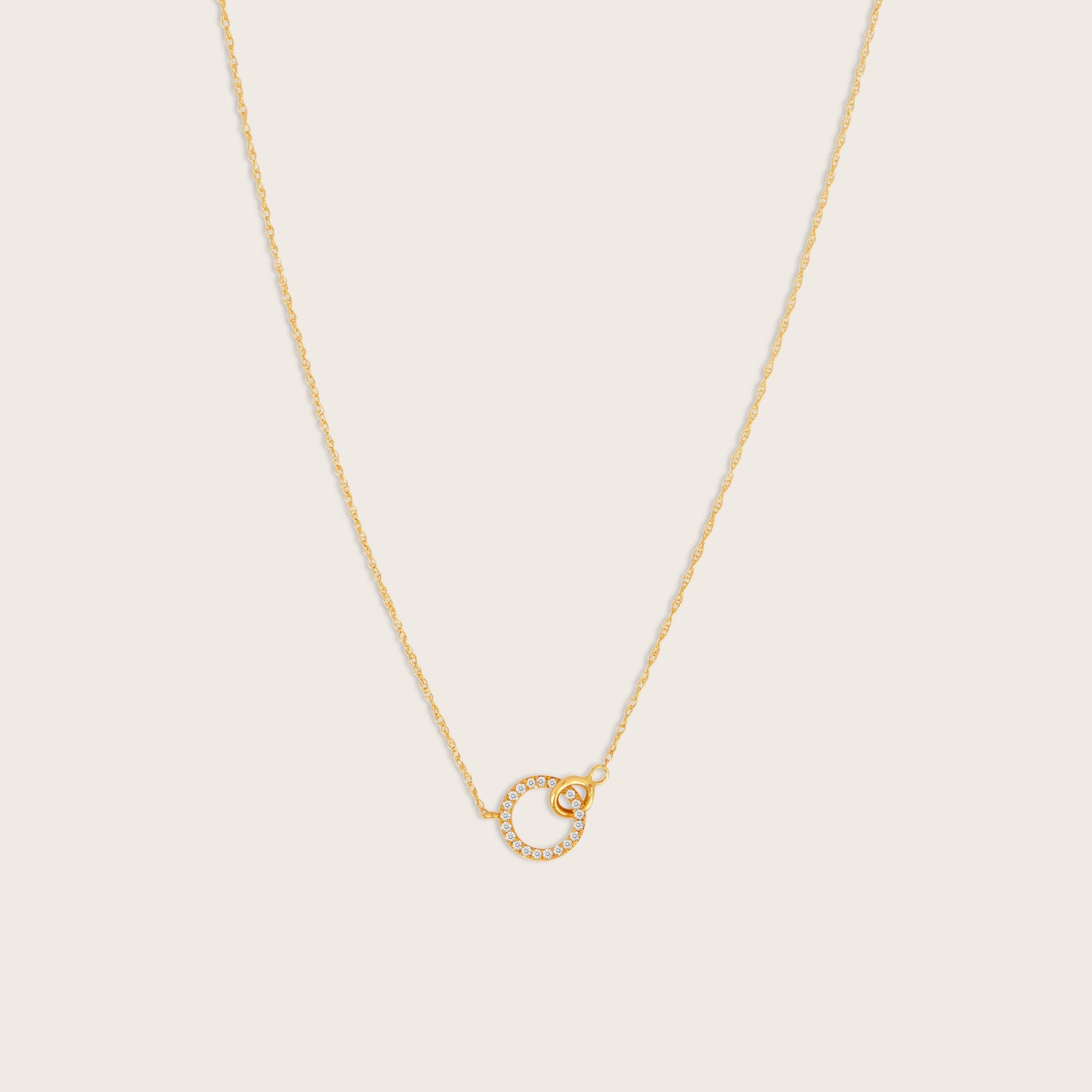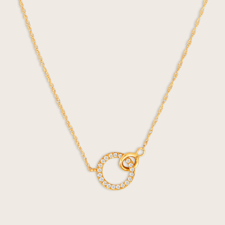 Crafted in 14K yellow gold with lab-grown diamonds (0.10 carat total weight). Necklace length: 16 inches with a 2-inch extender. Interlocking circles pendant design.