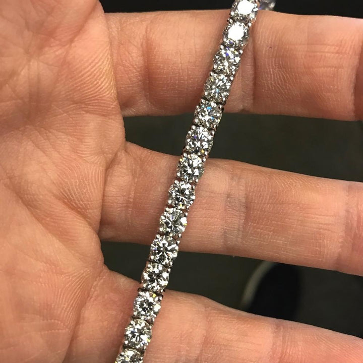 14k white gold with 38 round brilliant cut natural diamonds, totaling 15 carats. Bracelet length: 7 inches. Double lock clasp.