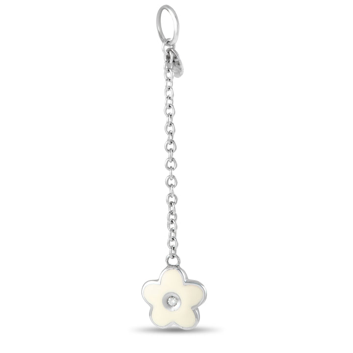 Made from 18K white gold, featuring diamonds and pink enamel accents. The charm comes with a gift box.