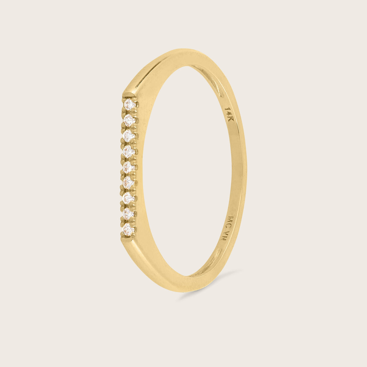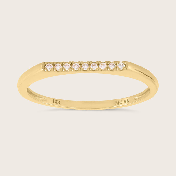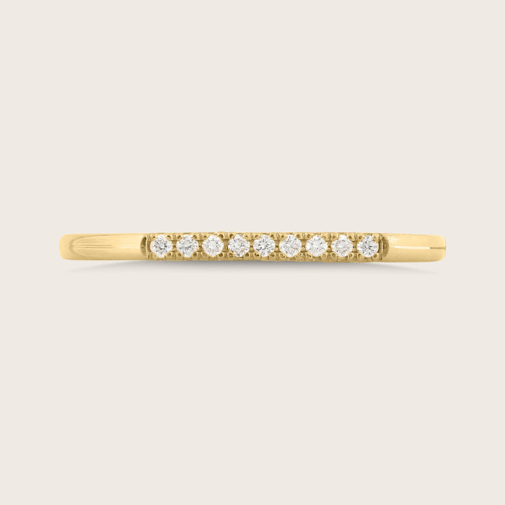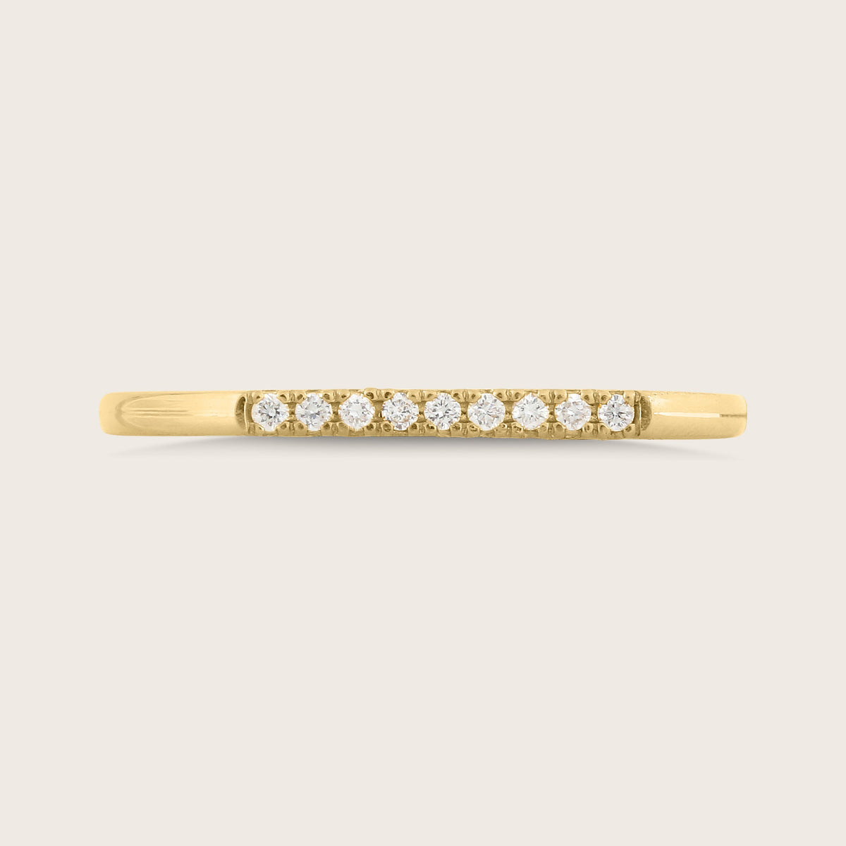 Crafted in 14K yellow gold. Set with 0.054 cttw of lab grown diamonds (0.5mm stones). Average band width: 1mm. Metal weight: 1.19g.