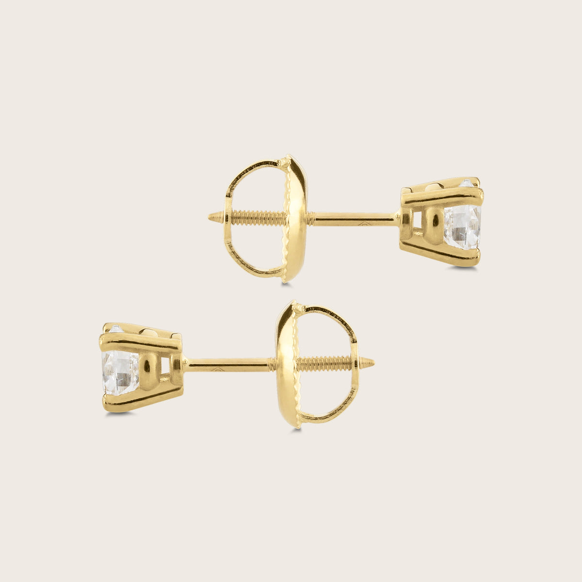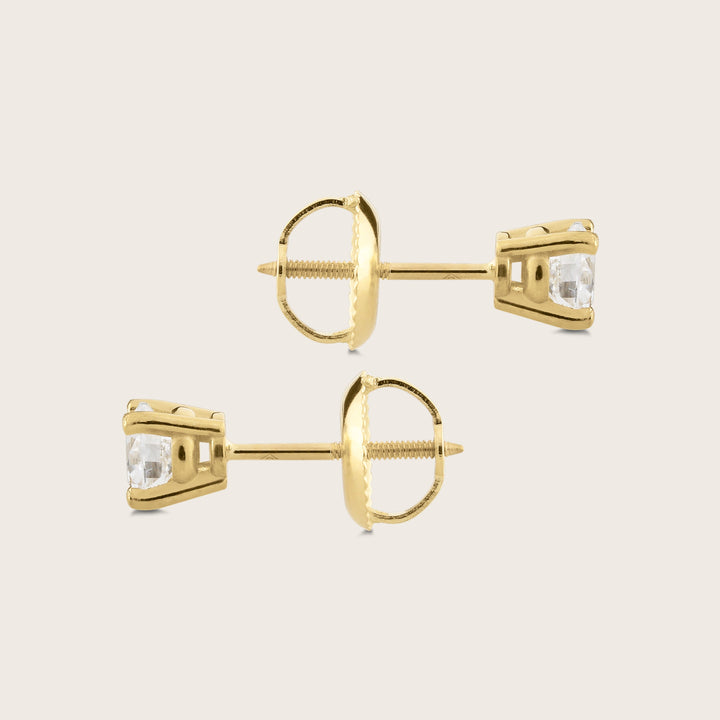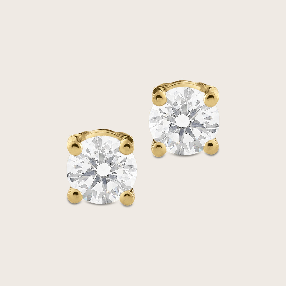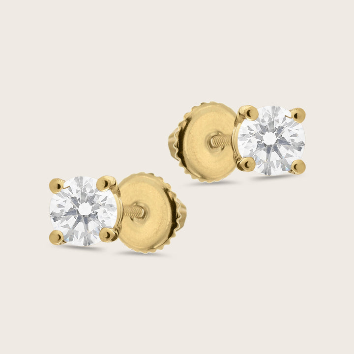 Crafted in 18K yellow gold with lab-grown diamonds totaling 2.00 carats (1 ct per stud). Stones measure 6.3mm; stud diameter is 5.6mm. Metal weight: 0.9g. Secured with screw post backs.