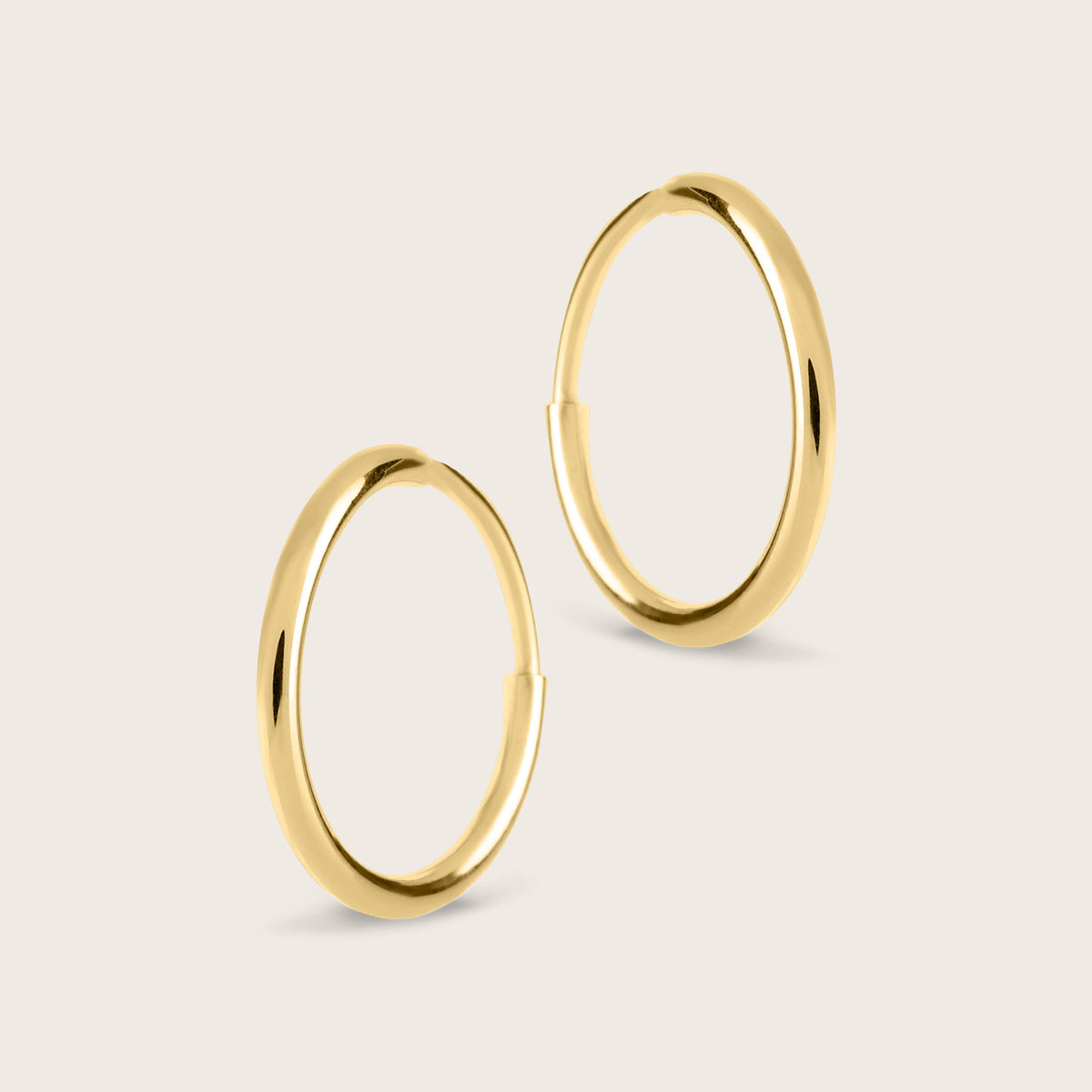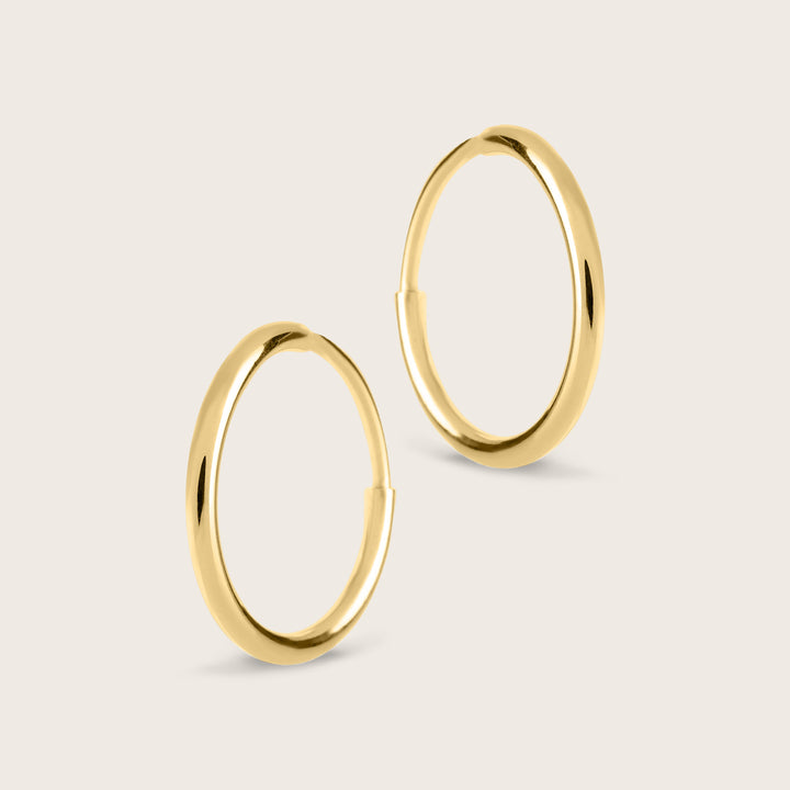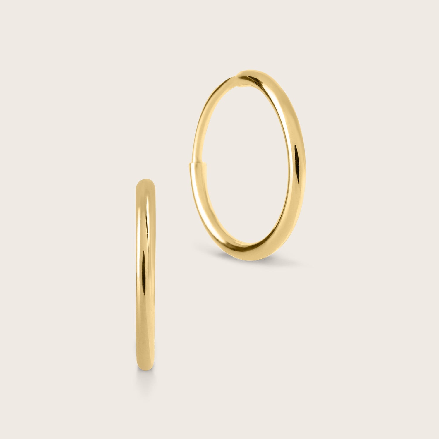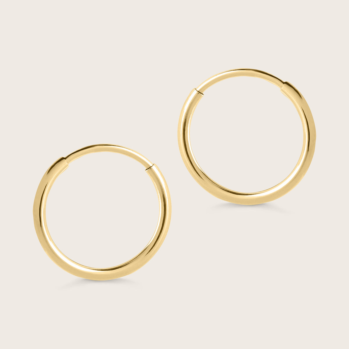 Crafted in 14K yellow gold. Hoop size: 14mm diameter, 1.25mm width. Earrings weigh 0.4 grams. Infinity hoop closure.