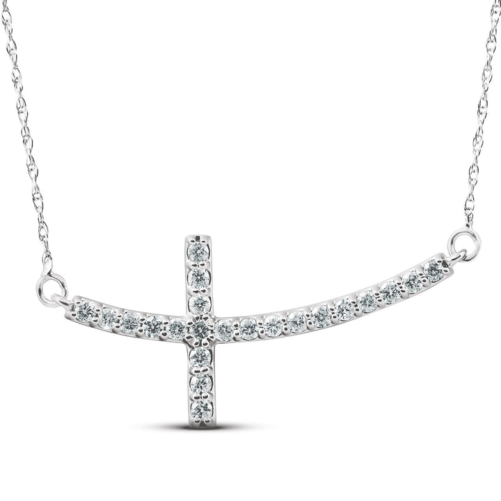 This .30 CT Diamond Sideways Cross Pendant Necklace by Pompeii3 is a classic piece featuring 22 round brilliant-cut diamonds set in a sideways cross pendant. The necklace is made of 14K white gold, offering a timeless and elegant look.