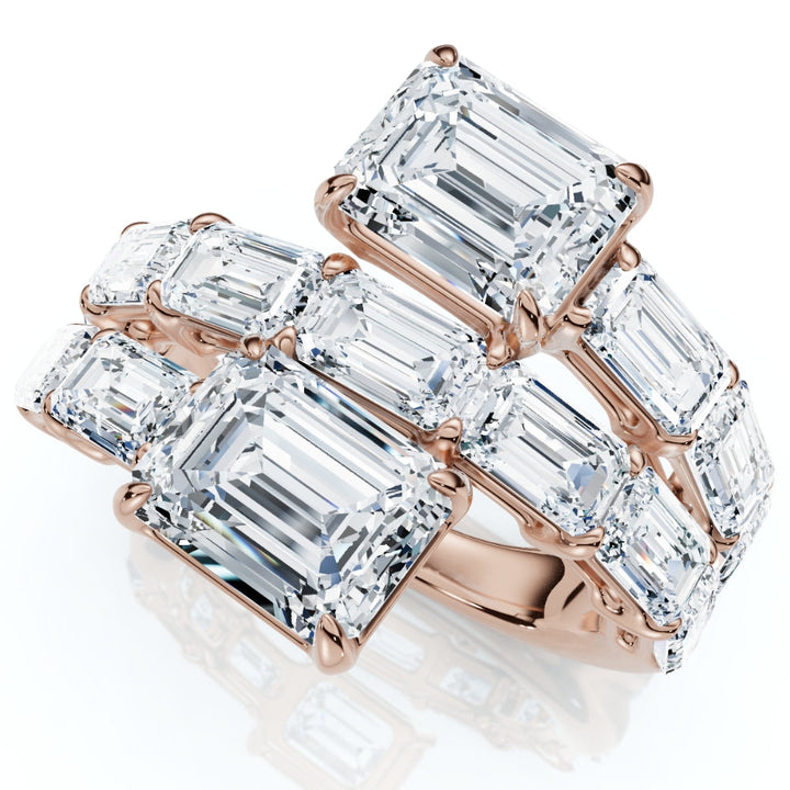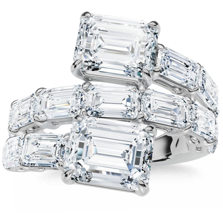 This 6 1/2ct Emerald Cut Diamond Ring by Pompeii3 is a stunning right-hand anniversary band that combines modern style with exceptional craftsmanship. Featuring 15 emerald-cut lab-grown diamonds set in a solid 14K white gold bypass mounting, this ring offers an elegant and unique design that sparkles with sophistication. The prong setting ensures each diamond is securely held, creating a magnificent and lasting statement piece.