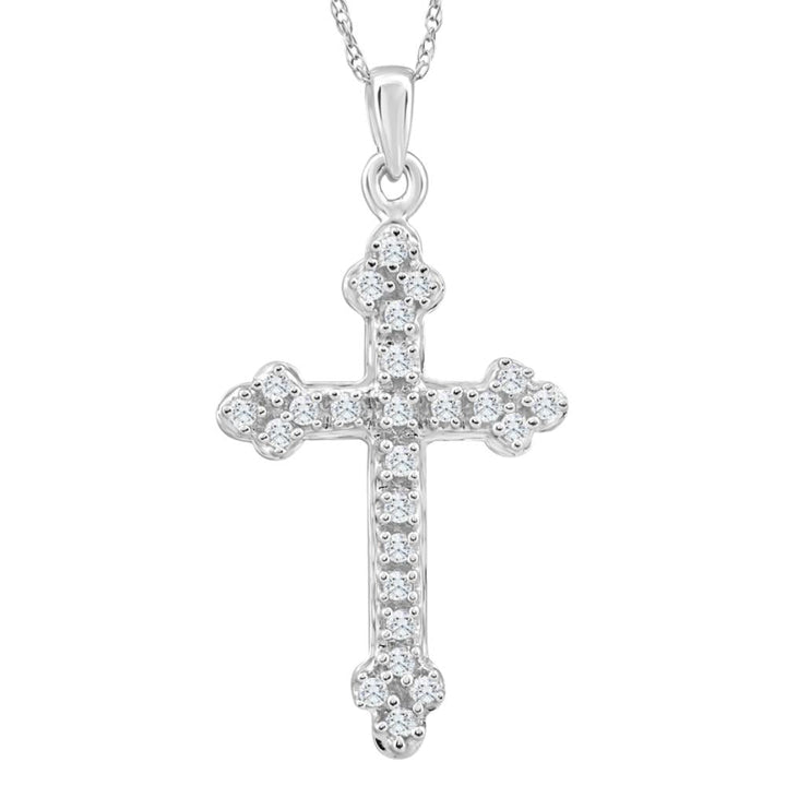 This 1/4ct T.W. Diamond Cross 10K White Gold Vintage Pendant Necklace by Pompeii3 is a beautifully crafted cross pendant, featuring 25 round-cut diamonds set in 10K white gold. The cross symbolizes faith and spirituality, while the diamonds add an elegant touch.