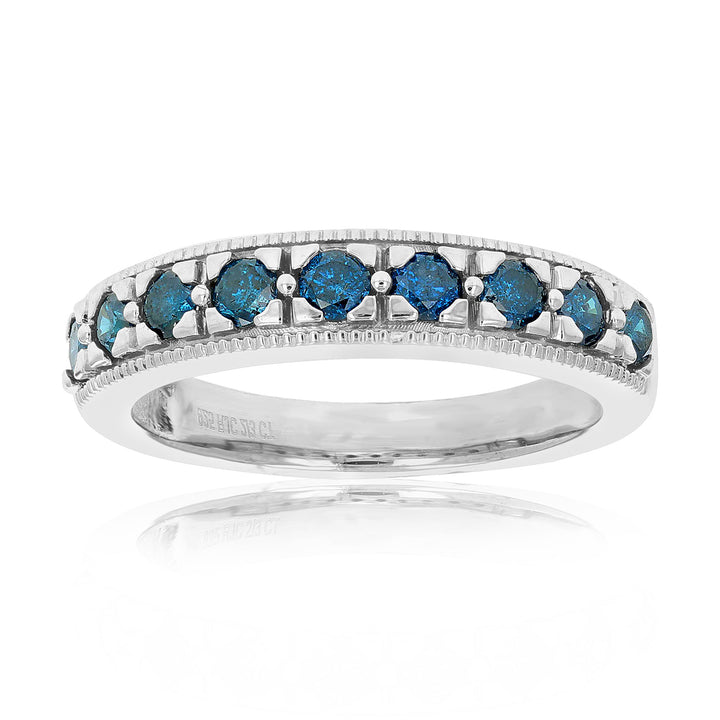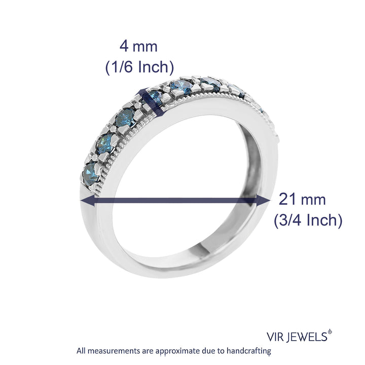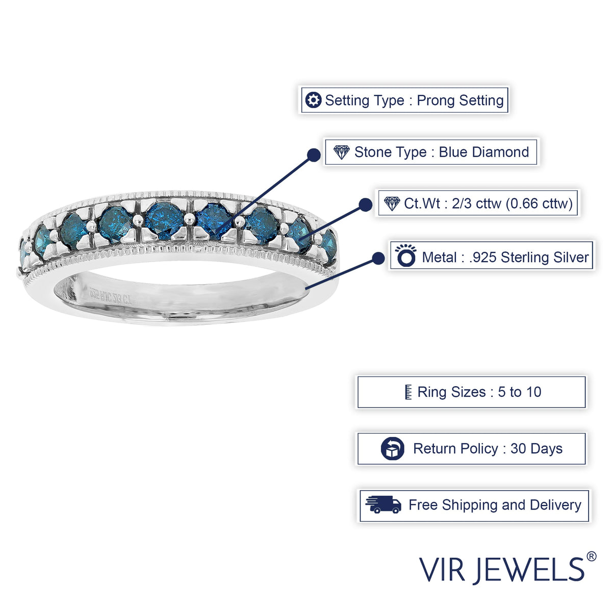 This 2/3 Cttw Blue Diamond Wedding Band in .925 Sterling Silver by Vir Jewels offers a stunning and elegant design. Featuring 9 sparkling round blue diamonds, totaling 0.66 carats, this band is beautifully crafted in high-quality sterling silver. The diamonds, irradiated to enhance their color, are set in a prong setting, giving the ring a radiant shine. A perfect choice for a unique wedding band or as a striking standalone piece.