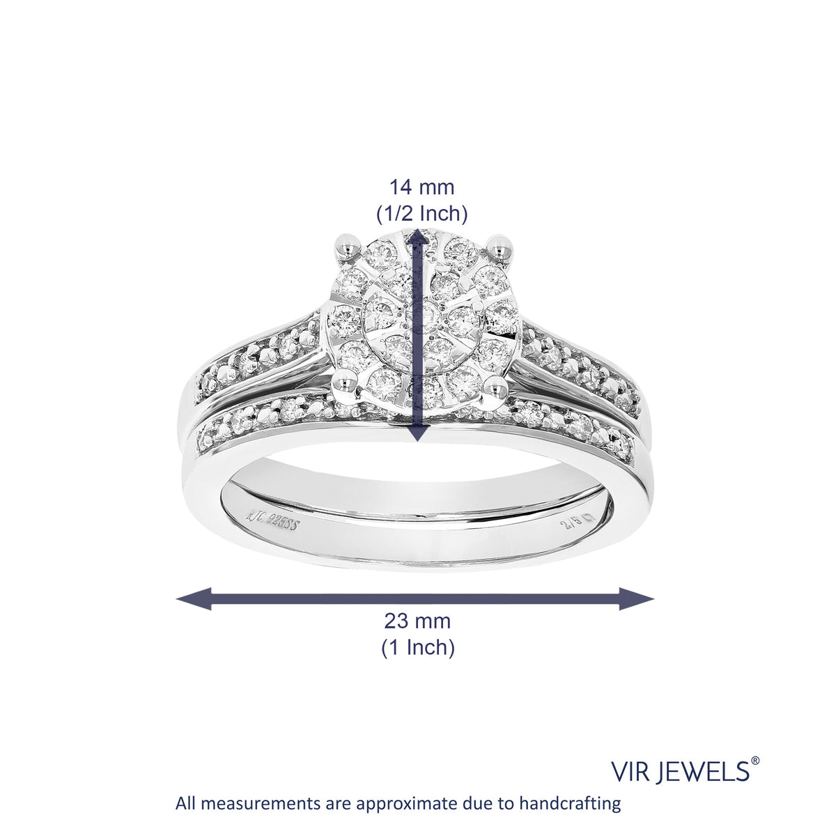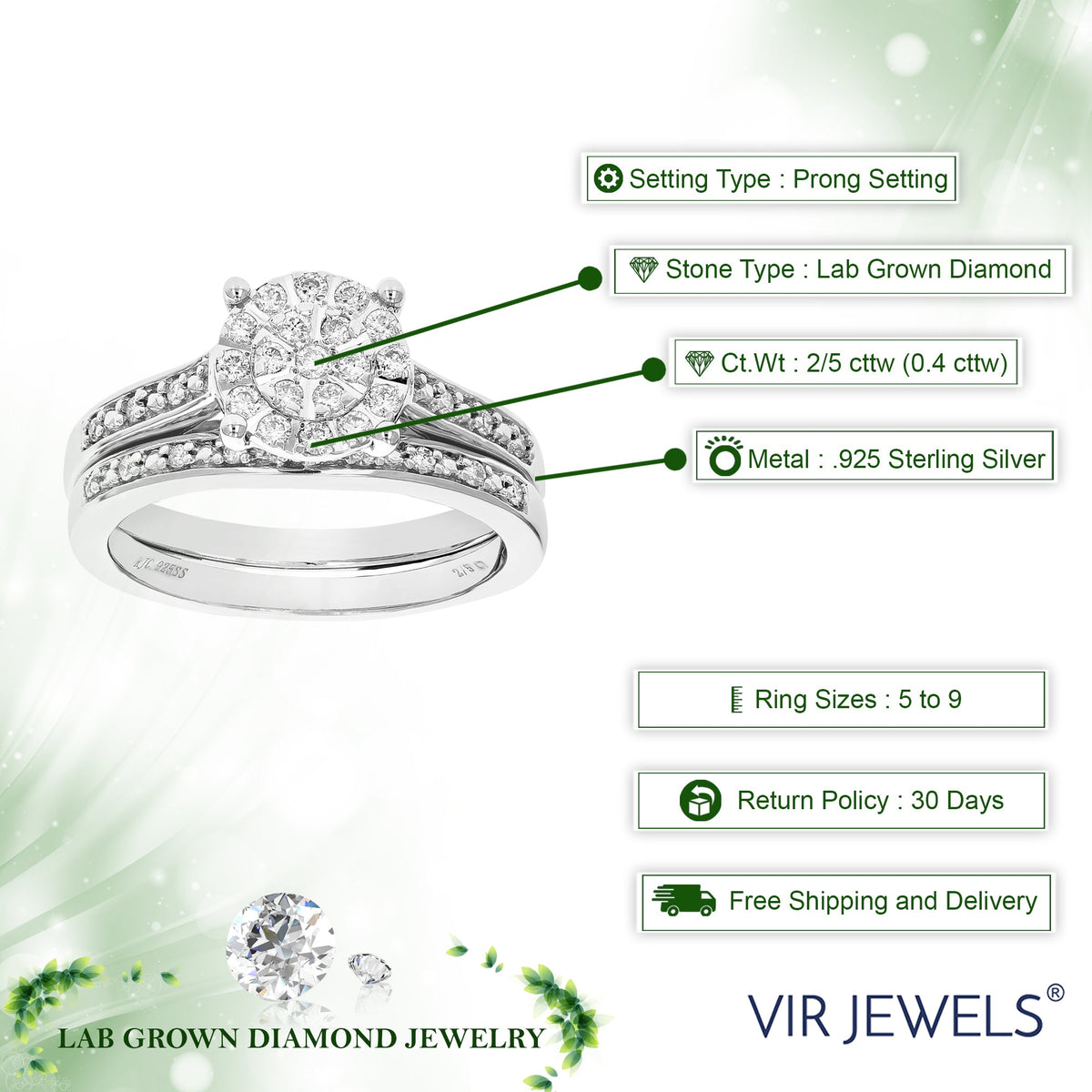 This 2/5 Cttw Lab Created Diamond Wedding Bridal Set in Sterling Silver by Vir Jewels is the perfect choice for those who value both beauty and sustainability. With 48 lab-grown diamonds set in a prong setting, this bridal set features a modern and chic design that will complement any engagement ring. The diamonds shine brilliantly against the sterling silver, creating a piece that exudes sophistication.