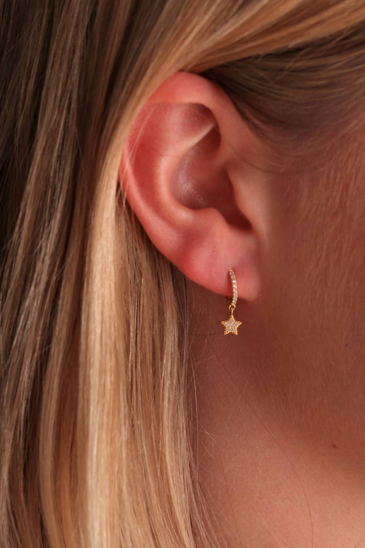 These Women's Fame Huggie Star Hoops in Gold by Color Shout are perfect for adding some starry sparkle to your everyday style. The 925 sterling silver plated in 18k yellow gold, with star-shaped drops and zircon stones, gives these huggies a chic and playful vibe.