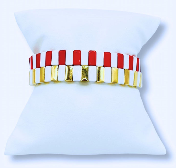 Made with enamel tiles in red, gold, and white. Each set includes two rectangle enamel stack bracelets. Length: 6.5 inches (unstretched).