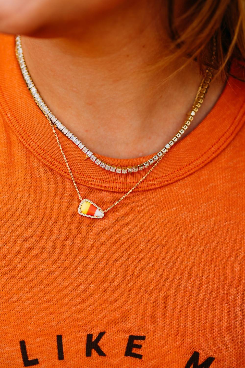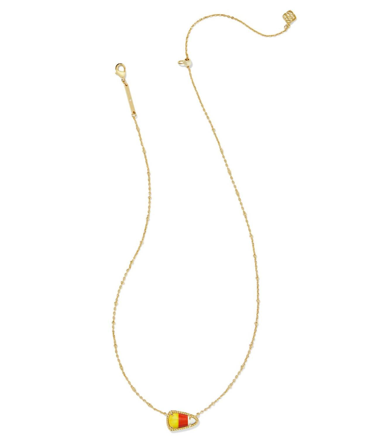 This Short Pendant Necklace in Candy Corn Magnesite by Kendra Scott is a fun and vibrant piece that adds a pop of color to any outfit. The pendant, featuring white, yellow, and orange-striped candy corn magnesite stone, is set in 14k yellow gold over brass. The adjustable chain ensures the perfect fit, making this a versatile piece that can be worn alone or layered with other jewelry.