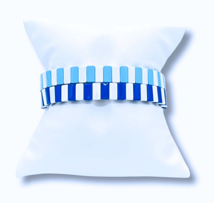 Crafted with enamel tiles in blue, light blue, and white, set on a stretch cord. Each bracelet measures 6.5 inches.