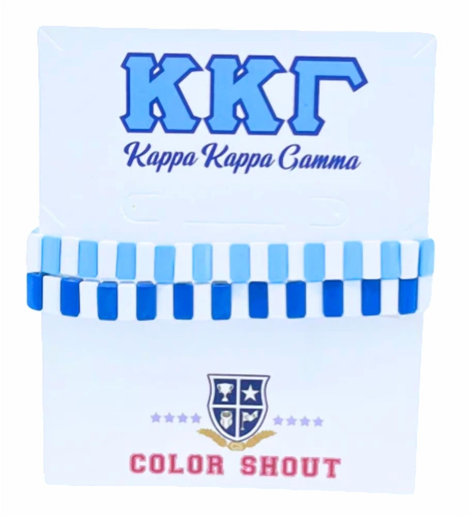 These Kappa Kappa Gamma Enamel Tile Double Stack Bracelets by Color Shout are designed for the modern individual who values boldness and style. The combination of blue and light blue enamel tiles brings an energetic yet refined look, perfect for layering or wearing solo. The double stack design offers versatility and an elevated sense of style. Crafted with a stretch cord, this bracelet is ideal for both casual and chic outfits, offering comfort with its adjustable fit.