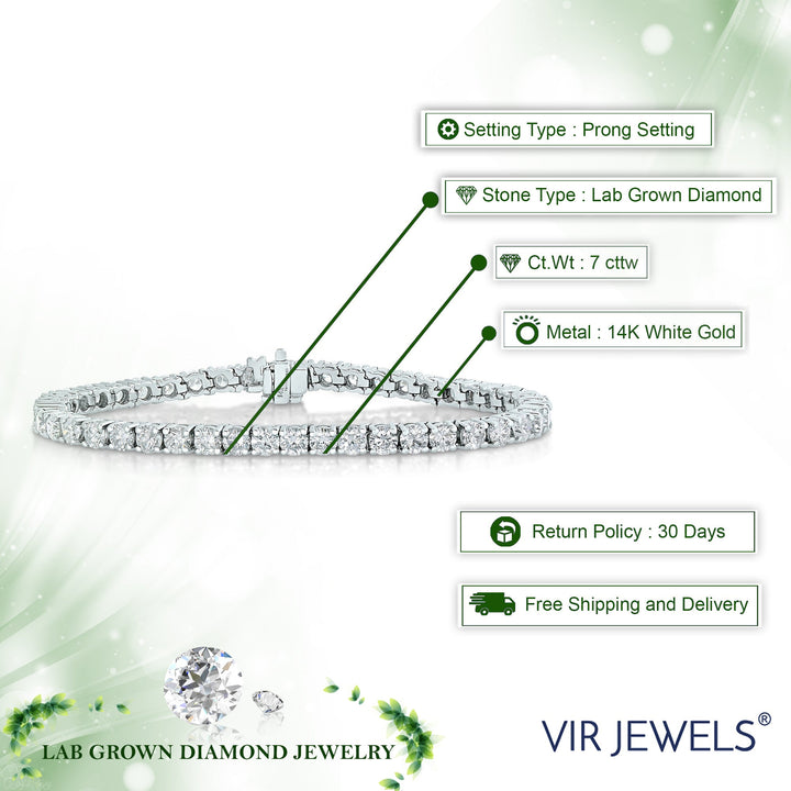 This 7 cttw Lab Created Diamond Tennis Bracelet in 14K White Gold by Vir Jewels is a stunning piece that features 50 dazzling round lab-grown diamonds, totaling 7 carats in weight. The diamonds are set in prongs, allowing for maximum light exposure and brilliance. Crafted from 14K white gold, this tennis bracelet is both luxurious and sustainable, making it the perfect ethical choice for those who appreciate fine jewelry. The box and tongue safety clasp ensure that the bracelet stays securely in place.