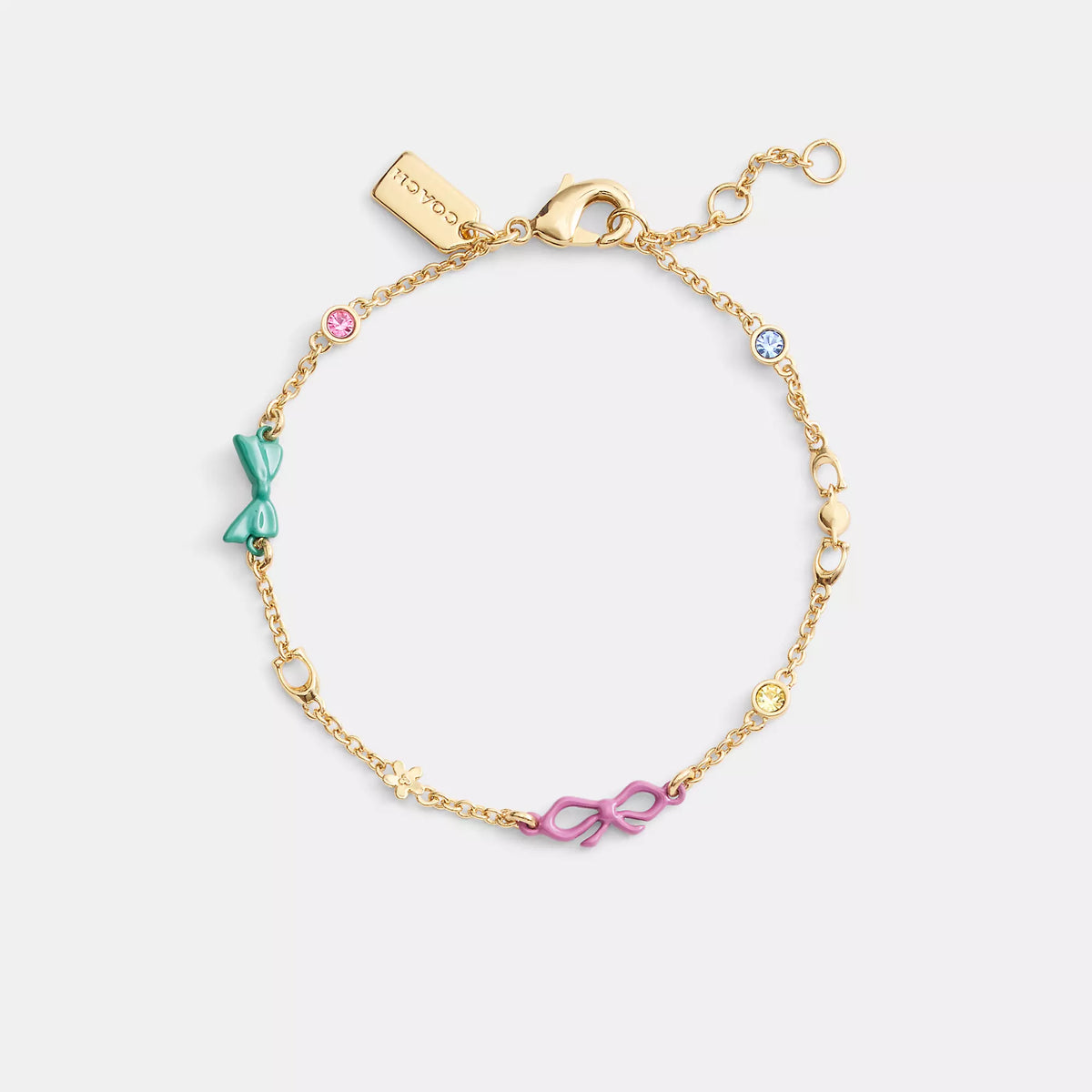 This Mini Bow Linear Bracelet by Coach is a delicate and charming piece that adds a subtle yet elegant touch to any outfit. The yellow-toned plated brass is adorned with glass and cubic zirconia accents, creating a sophisticated sparkle. Perfect for layering or wearing on its own, this bracelet features an adjustable fit to ensure a perfect fit for most wrist sizes.