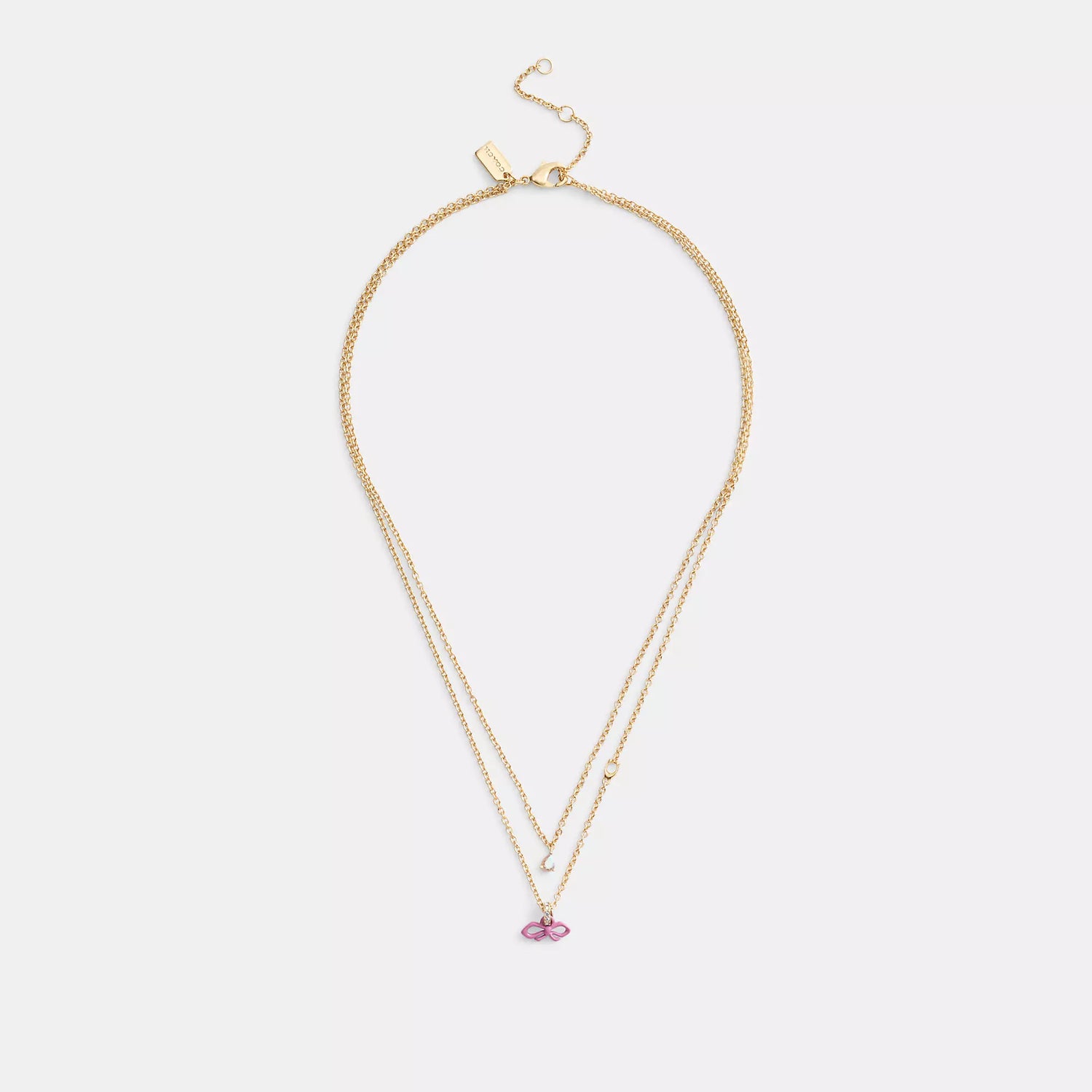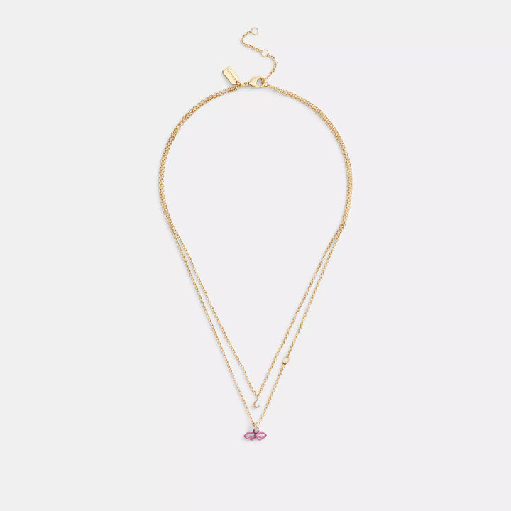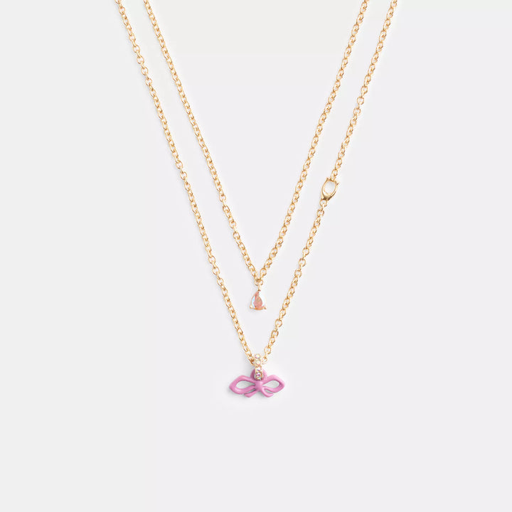 This Coach Mini Bow Layered Necklace is a playful yet sophisticated piece featuring a pink bow design. Crafted in plated brass, this necklace includes cubic zirconia stones for added sparkle, perfect for adding a sweet touch to any outfit.