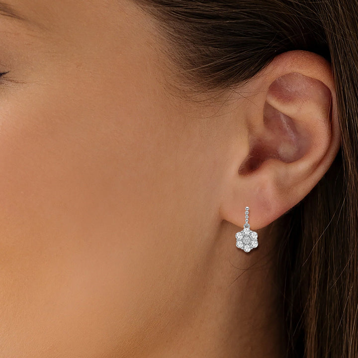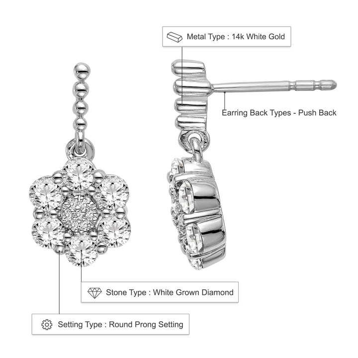 14K White Gold 0.88 CT Lab Grown Diamond Floral Dangle Earrings VS Clarity G-H Color