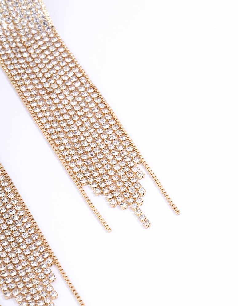 These Lovisa Gold Multi-Chain Pointed Drop Earrings are perfect for making a statement with a glamorous tapered silhouette adorned with sparkling diamantes, offering a bold and fashionable addition to any look.