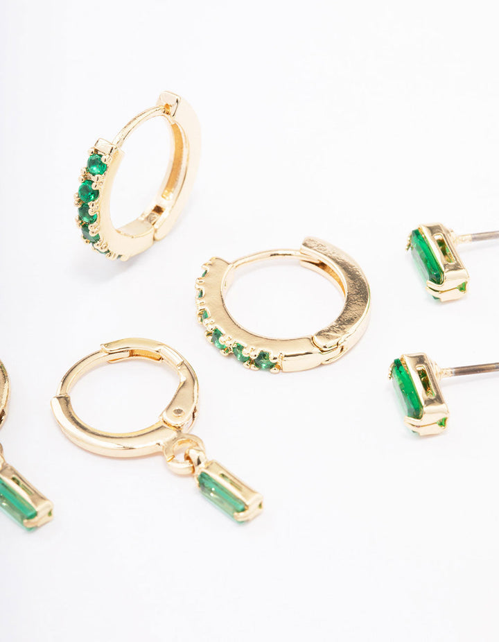 Gold plated, cubic zirconia emerald green baguette-cut stones, set of 3 pairs (studs and huggies).