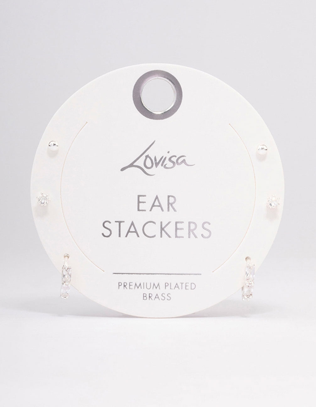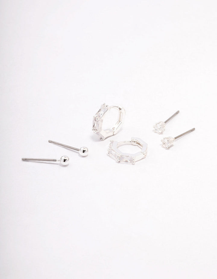 These Lovisa Silver Plated Baguette Huggie Earring 3-Pack from the Luxe collection feature sparkling baguette-cut crystals. This set offers a modern design with two pairs of matching silver bead and crystal inlay studs for an elegant touch.