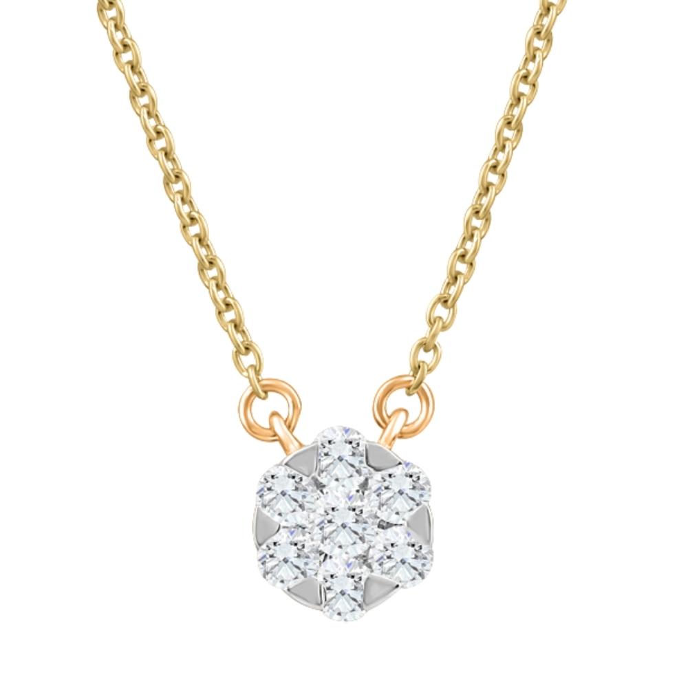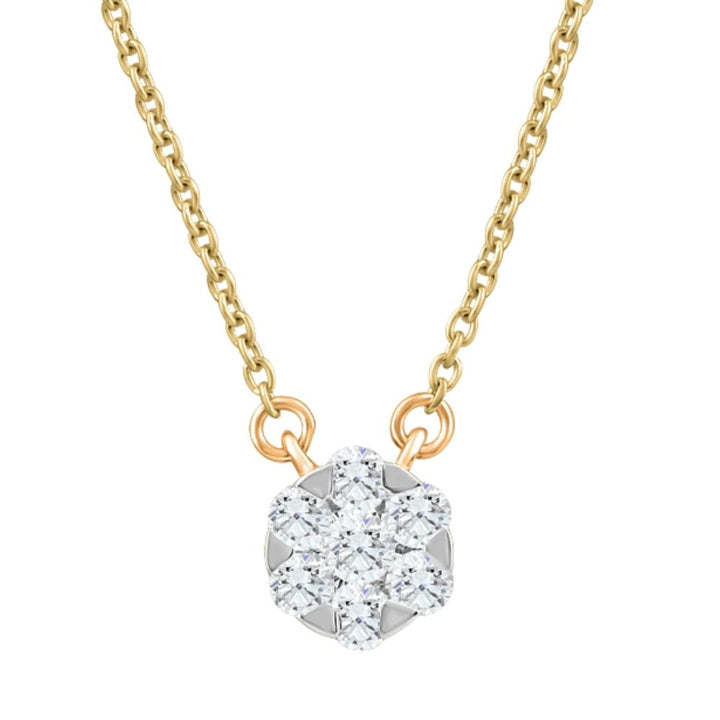 10K yellow gold with 9 round brilliant cut lab-grown diamonds totaling 0.25ct. Pendant measures 6.3mm wide and hangs from an 18-inch chain.