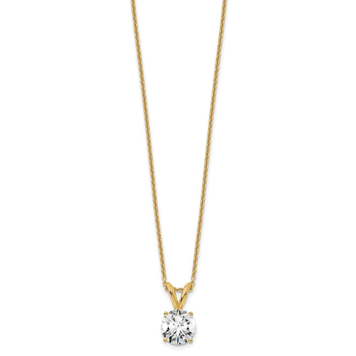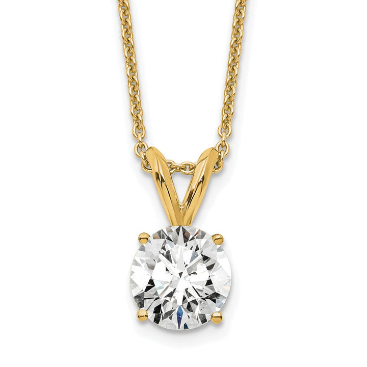 Made of 14K yellow gold, featuring 0.75ct round lab-grown diamond with VS clarity and G-H color. Pendant hangs on an 18-inch chain with a lobster clasp.