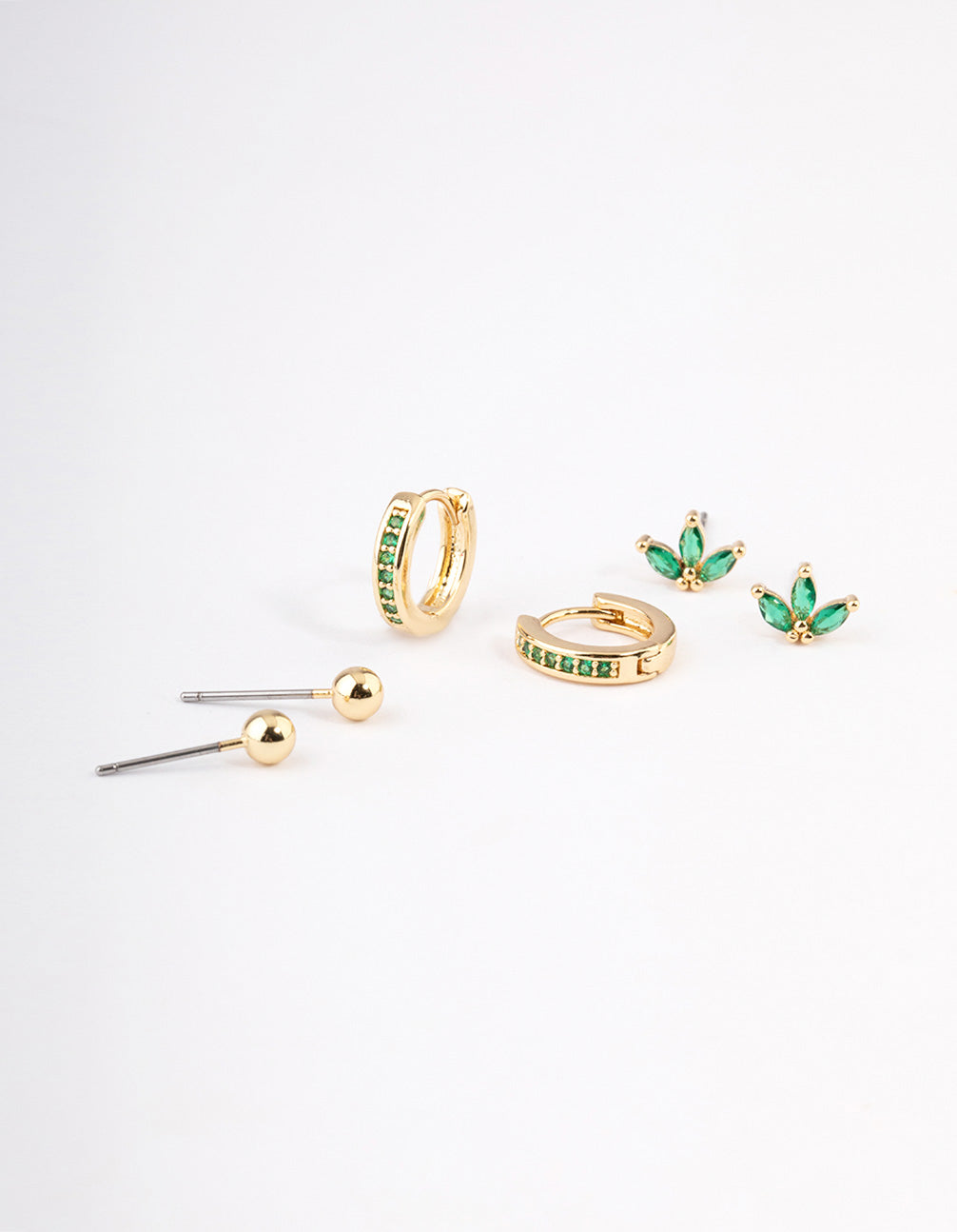 Gold plated, cubic zirconia, brass, includes 3 pairs (stud and huggie earrings).