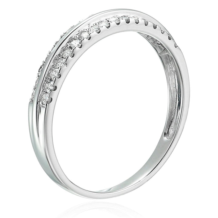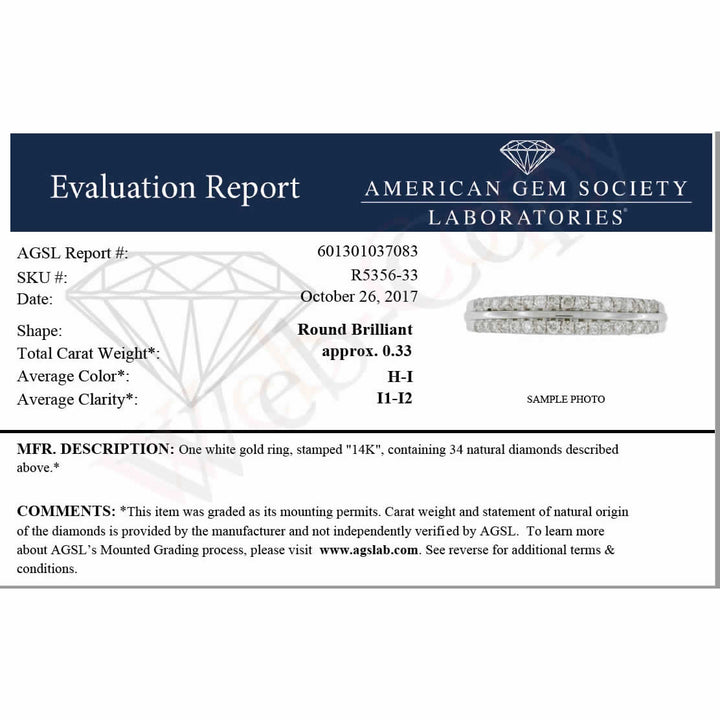 Handcrafted in 14K white gold with 34 natural round diamonds totaling 1/3 carat (color G-H, clarity I1-I2). Weight: 1.3 grams. AGS certified with unique number.