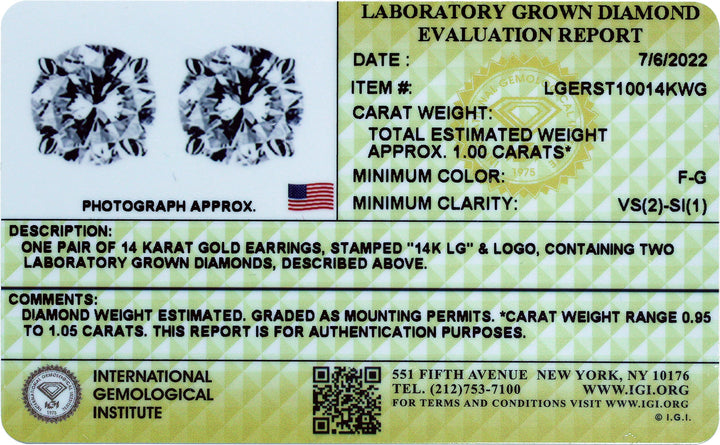 Made from 14K white gold, these earrings feature 1ct of IGI-certified lab-grown diamonds in F-G color and VS1-VS2 clarity. They weigh 0.9 grams and come with screw-back posts.