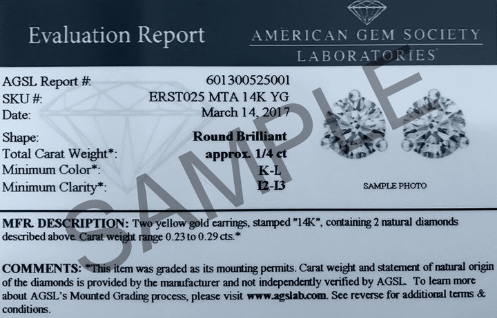These 1/4 Carat TW AGS Certified Martini Set Round Diamond Solitaire Earrings in 14K Yellow Gold by SSELECTS feature a minimalist and elegant design. The 1/4 carat diamonds are set in a 3-prong martini setting, adding a chic and sophisticated look to any outfit.