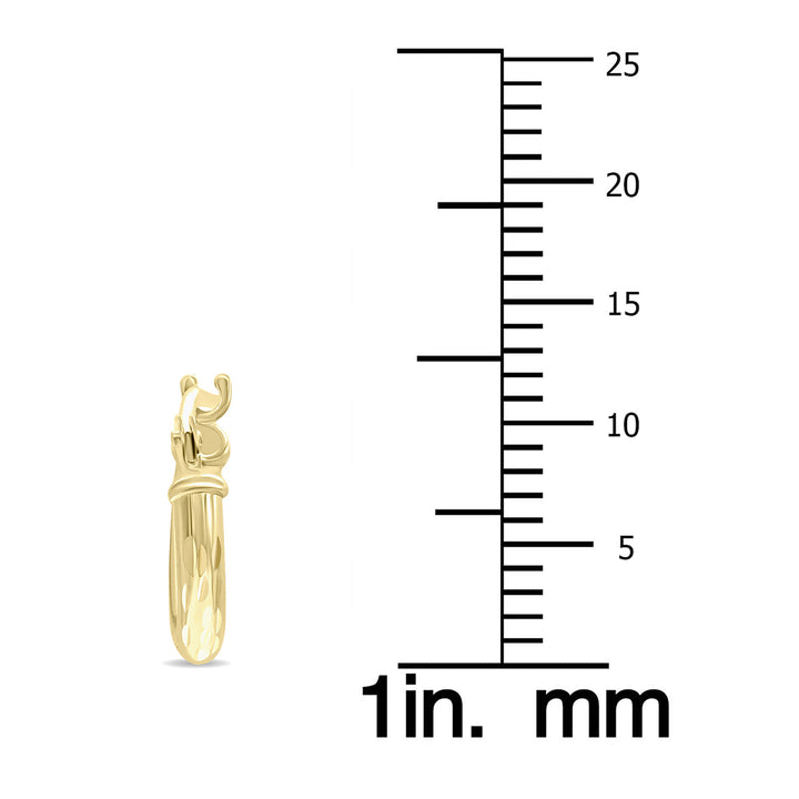 These 10K Yellow Gold Shiny Diamond Cut Engraved Hoop Earrings 12mm by SSELECTS: These elegant hoop earrings are crafted from 10K yellow gold and feature detailed diamond cut engraving, adding texture and shine. With a 12mm diameter, these hoops offer a stylish design that transitions seamlessly from day to night. The earrings are secured with durable snap-down latch clasps, ensuring a comfortable and secure fit.
