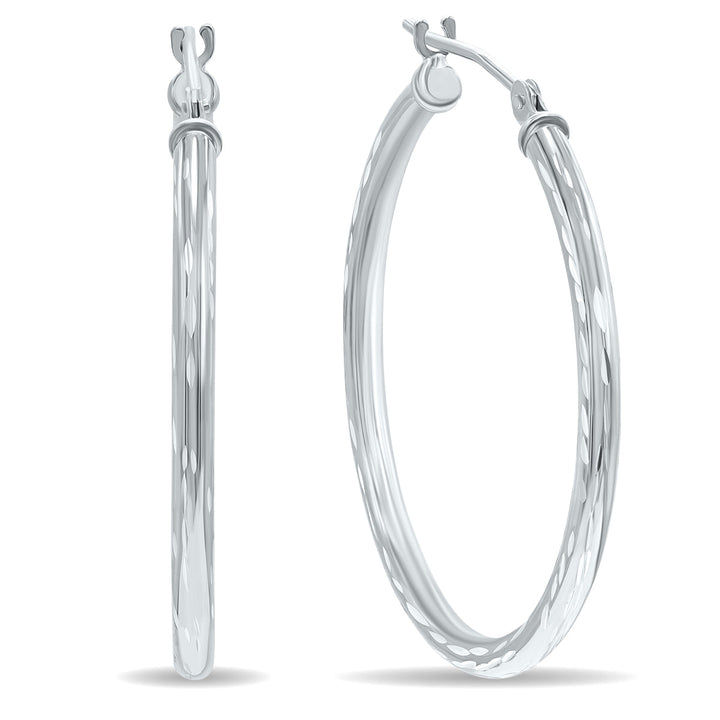 These 10K White Gold Shiny Diamond Cut Engraved Hoop Earrings 30mm by SSELECTS: These 30mm 10K white gold hoop earrings feature a stylish diamond cut engraving that gives them a beautiful shiny finish. The snap-down latch ensures secure wear, and the classic design makes them suitable for various occasions.