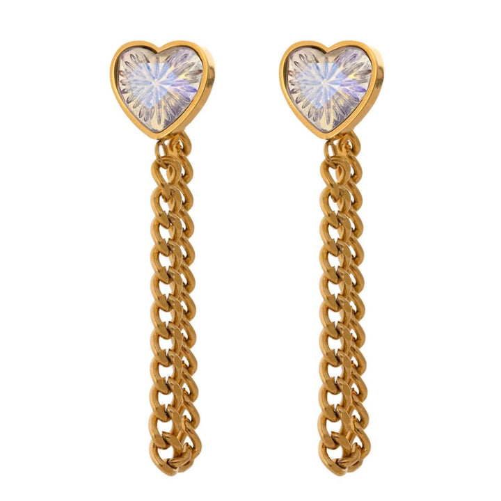 Crafted in stainless steel, electroplated with real gold, featuring cubic zirconia stones. Drop earring style.