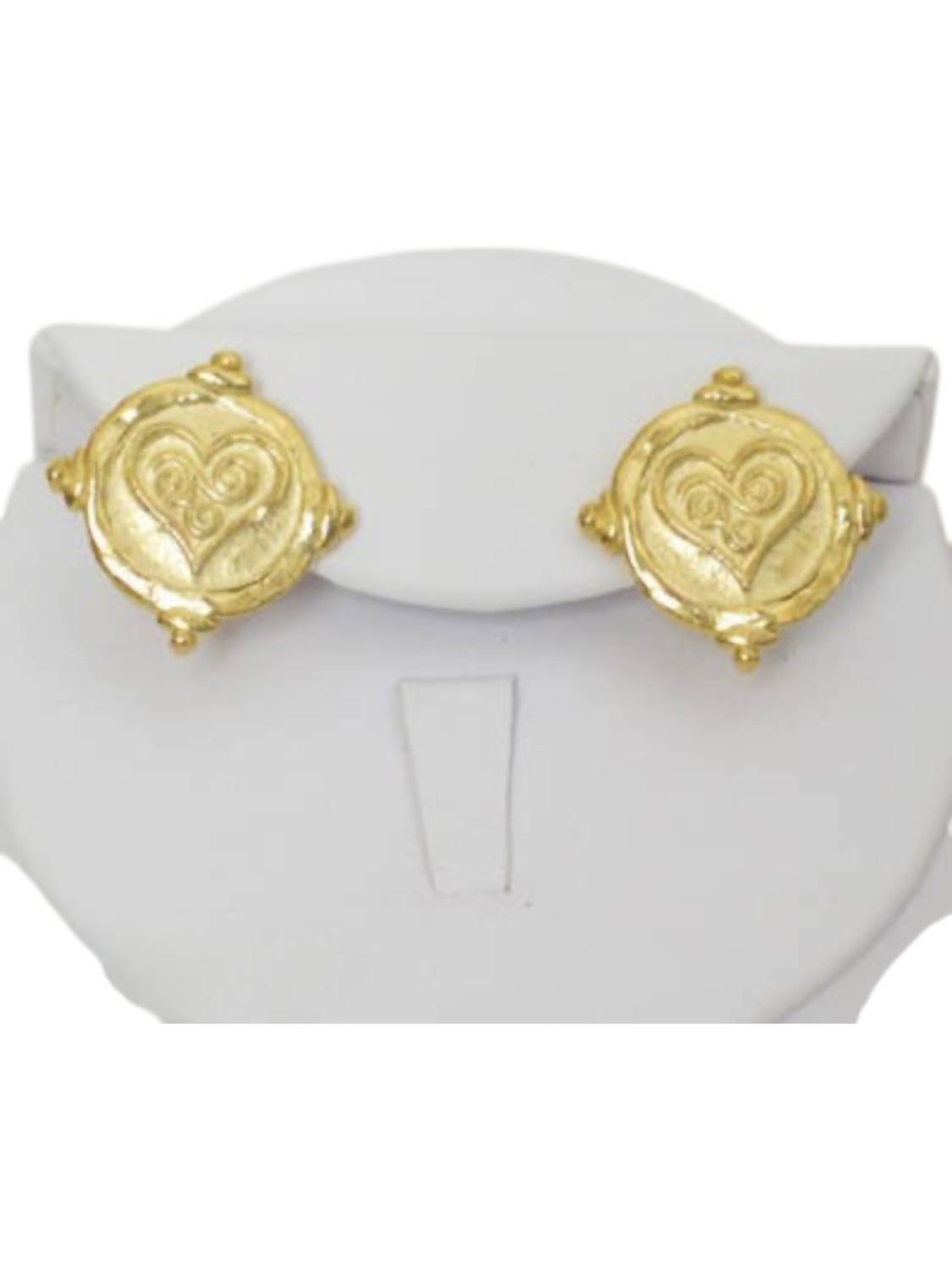 These Heart Intaglio Stud Earrings in Gold by Susan Shaw feature a heart intaglio design, adding a touch of romance and elegance. Plated in 24kt gold and measuring 1.25 inches in diameter, these stud earrings are handmade in San Antonio, TX, offering a timeless, artisan-crafted look.