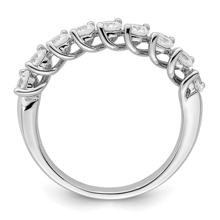 14K White Gold Lab Grown Diamond 9-Stone Band Ring 1ct by Diamond2Deal is an elegant eternity band featuring nine brilliant lab-grown diamonds with G-H color and VS clarity. This timeless design exudes unmatched sparkle and sophistication, making it a sustainable choice for daily wear or special occasions. The band ring effortlessly elevates any outfit, making it an essential addition to any jewelry collection.