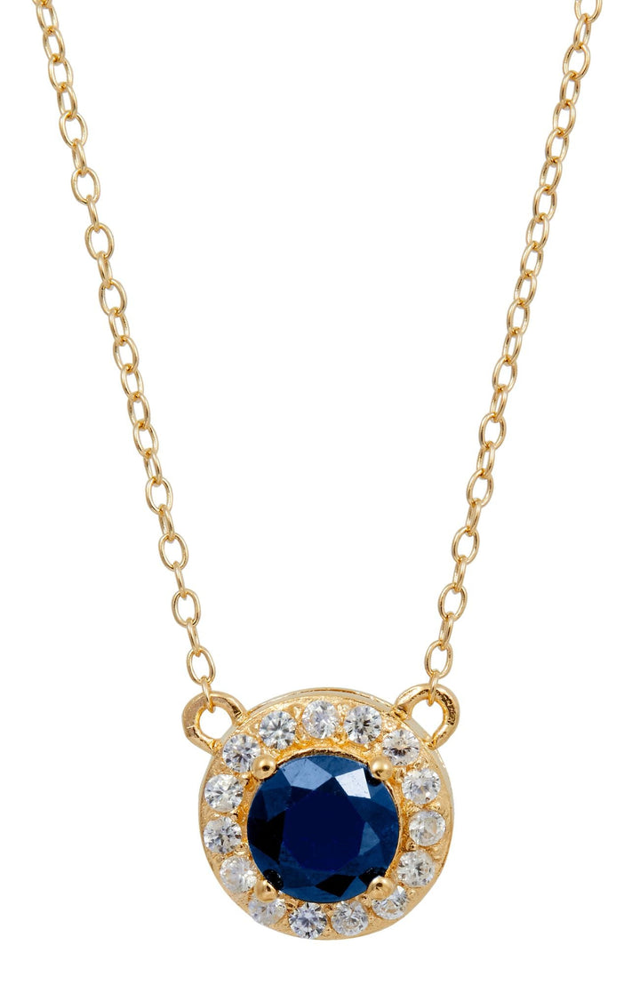 This 18K Gold Vermeil over Sterling Silver Natural Blue Sapphire and White CZ Pendant Necklace by Savvy Cie is a stunning halo necklace featuring a blue sapphire center, surrounded by sparkling white cubic zirconia. Perfect for elevating any outfit, this 18-inch necklace combines luxury and craftsmanship for a sophisticated look.