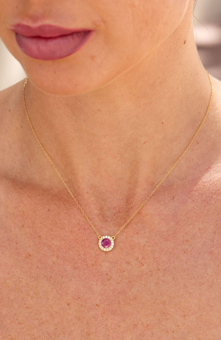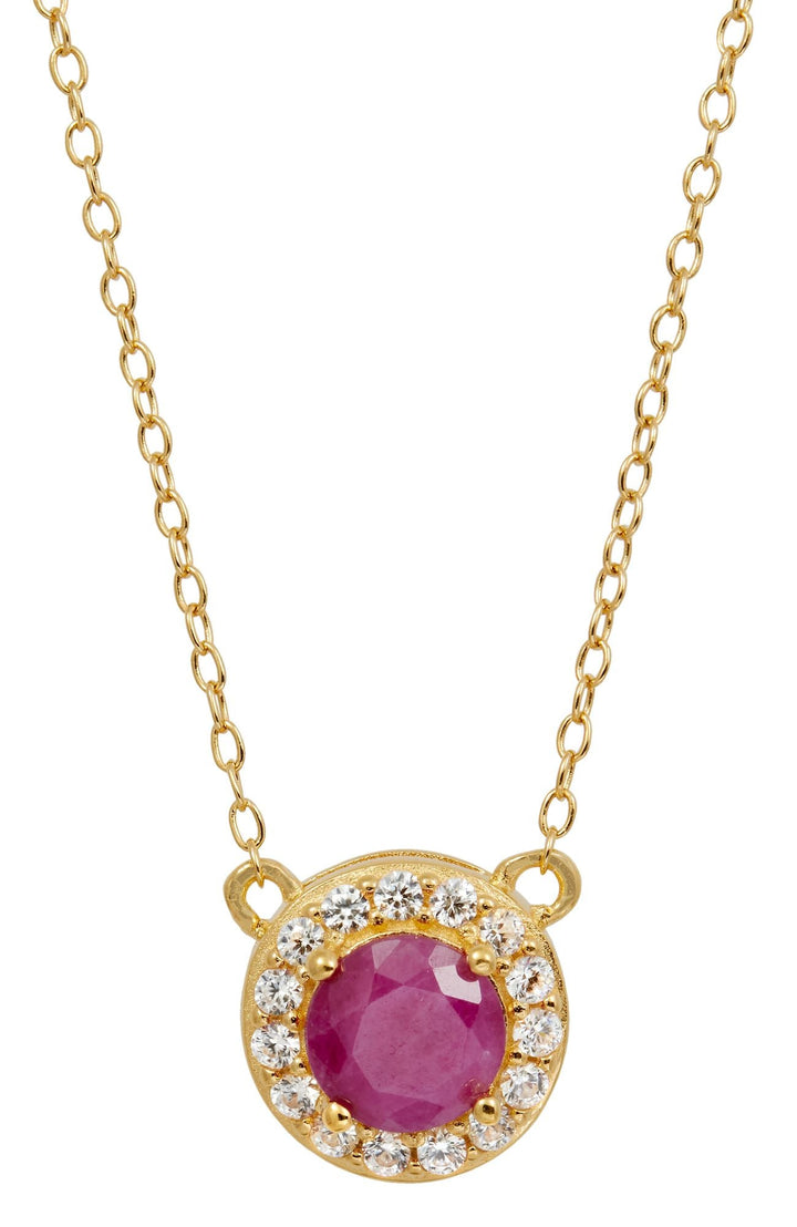 18K gold vermeil over sterling silver, with a 10mm pendant. Features natural ruby and white cubic zirconia.