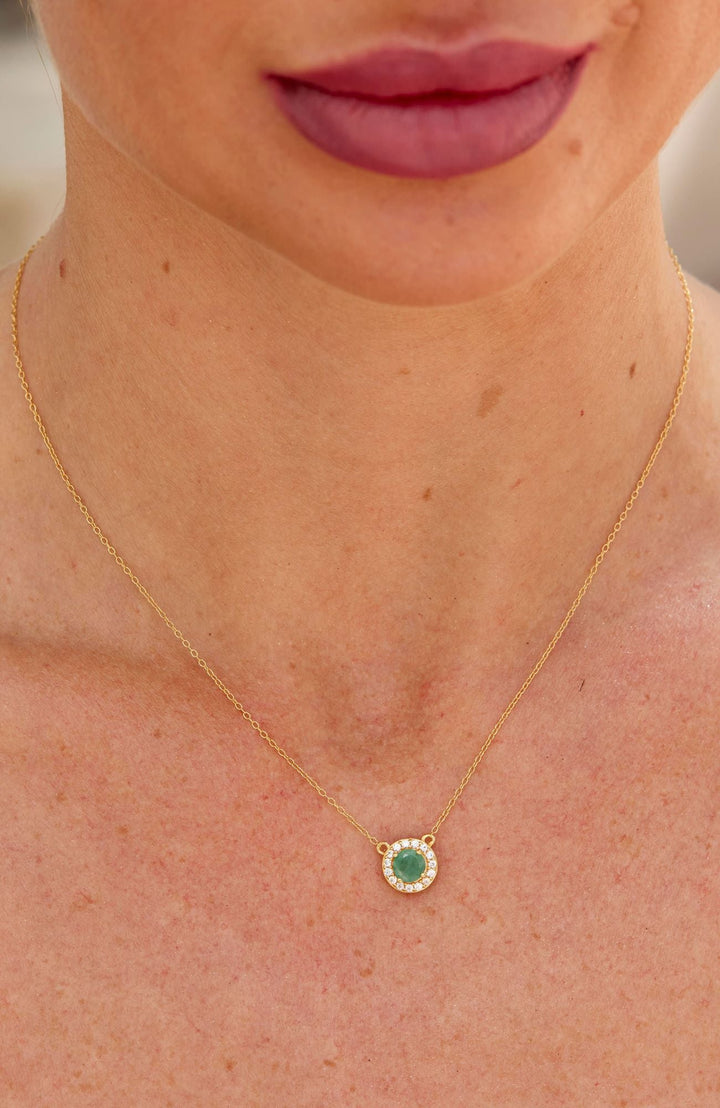 This 18K Gold Vermeil Over Sterling Silver Natural Emerald and White CZ Pendant Necklace by Savvy Cie features an exquisite halo of emerald and white cubic zirconia, crafted in 18K gold vermeil, perfect for elevating any occasion.