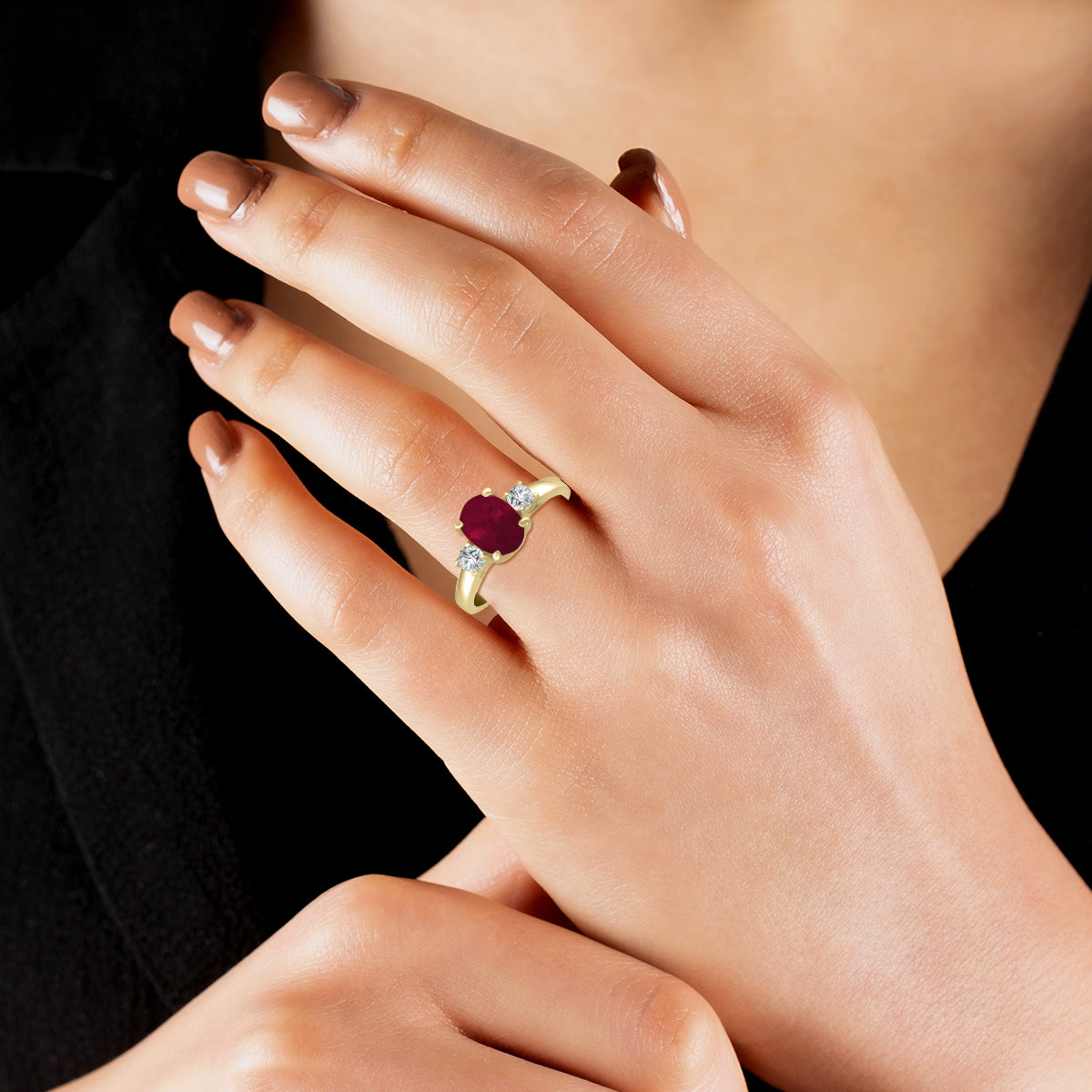 This Ruby and Diamond Three Stone Ring by SSELECTS brings refined elegance to life through rich color and timeless design. A vivid oval-cut ruby sits at the heart of this piece, its 8x6mm silhouette glowing with regal intensity. Flanked on each side by brilliant round diamonds, the composition radiates a sense of balance and strength. The polished 14K yellow gold band offers a warm, liquid-smooth finish that feels as luxurious as it looks. A classic three-stone setting that symbolizes the past, present, and future—this ring is as meaningful as it is beautiful.