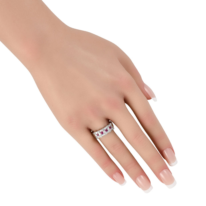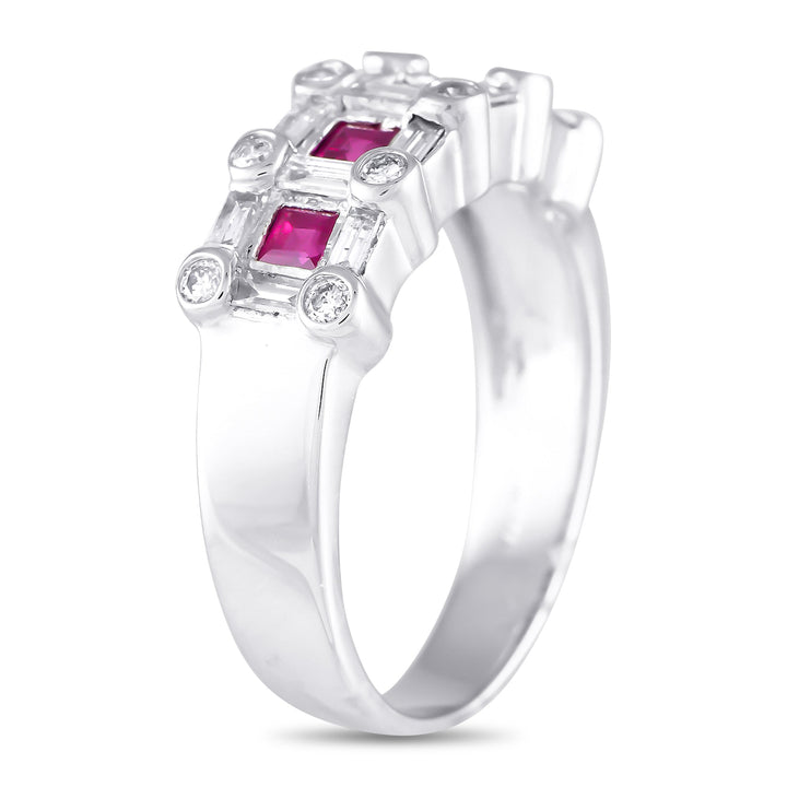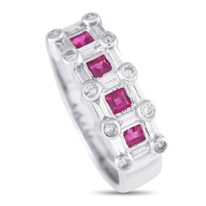 This LB Exclusive 14K White Gold 0.60ct Diamond And Ruby Ring features vibrant ruby gemstones totaling 0.50 carats, accented by bezel-set diamonds with a total weight of 0.60 carats. Set in 14K white gold, this elegant ring is a beautiful statement piece.