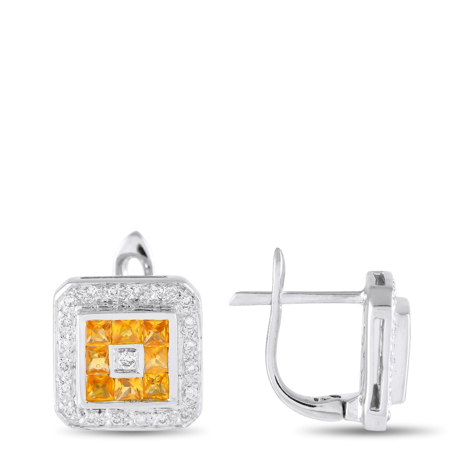 These LB Exclusive 14K White Gold 0.33ct Diamond and Sapphire Earrings feature a stunning symmetrical design with diamonds and yellow sapphires. The square setting and the radiant yellow sapphires bring a vibrant contrast, adding extra sparkle and visual impact to these exquisite earrings. Perfect for adding a pop of color to any occasion.