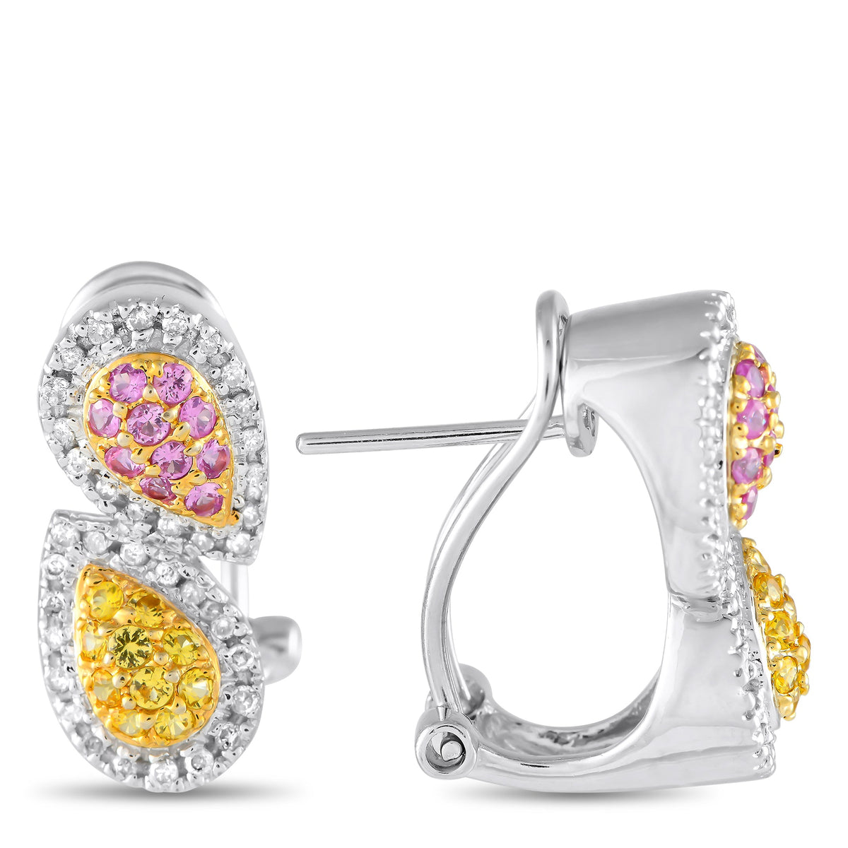 Made from 14K white gold, these earrings feature 0.33ct of diamonds and 0.67ct of pink and yellow sapphires. They measure 0.75 inches long by 0.25 inches wide.